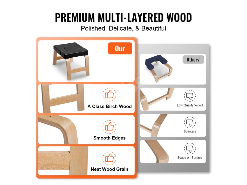 Obrácená židle na jógu vyrobená z březového dřeva třídy A má leštěnou, měkkou a atraktivní povrchovou úpravu. Díky hladkým hranám a hladké struktuře dřeva dodá každému studiu jógy nebo domácí tělocvičně nádech elegance.