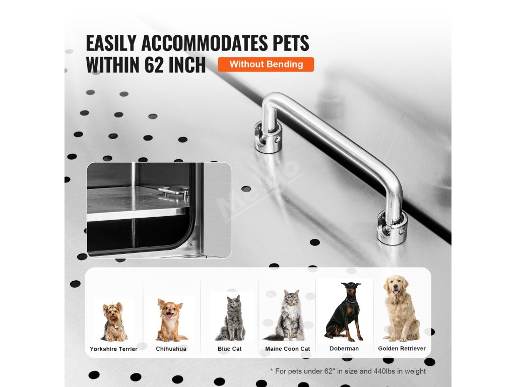 Vhodná pro domácí zvířata do velikosti 62 palců a hmotnosti až 440 liber. Bezešvý svařovaný rám pro netěsnící konstrukci, vyrobený z nerezové oceli pro odolnost proti korozi a trvanlivost, což zajišťuje dlouhodobé používání.