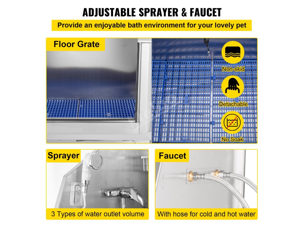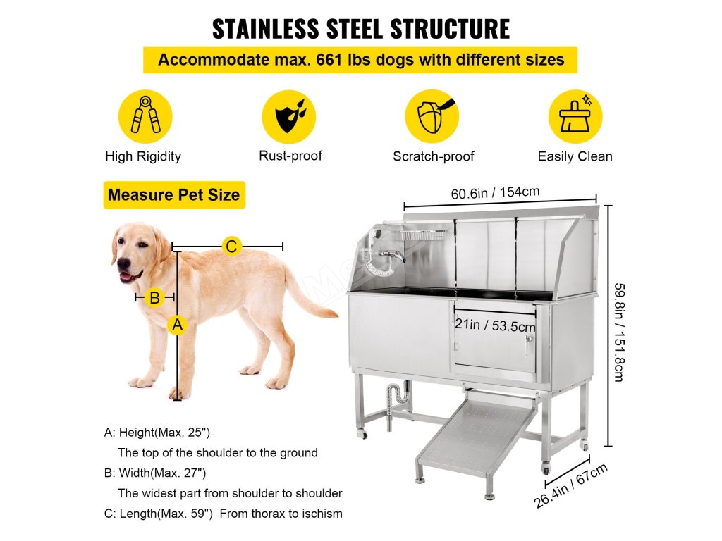 Mycí stanice pro zvířata je vyrobena z nerezové oceli, která umožňuje, aby pečovatelská vana unesla až 661 kg nákladu. Díky robustní konstrukci můžete koupat pro klid vašeho domácího mazlíčka.
