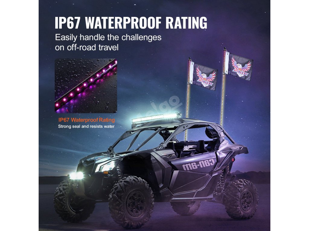 Ideální pro vozidla DC12V-24V včetně UTV, ATV, motocyklů, RZR, Can-ams, nákladních vozidel, terénních vozidel a motokár. Naše bičové světlo zajistí, že vaše vozidlo bude během nočních jízd a dobrodružství v terénu vynikat jako nejjasnější.