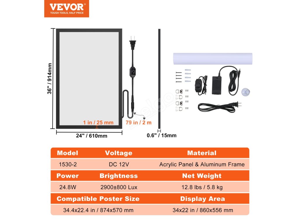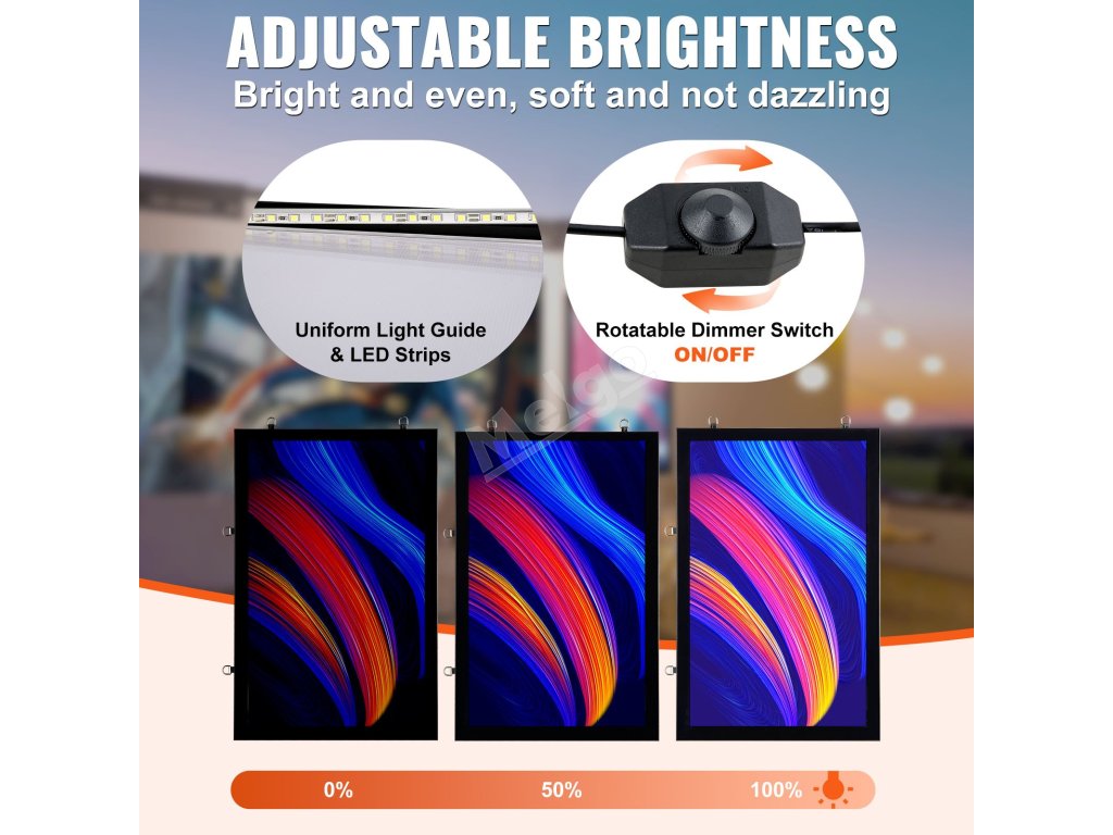 Lehký hliníkový rám LED lze snadno připevnit na jakýkoli povrch stěny. Akrylová deska (oboustranná ochranná fólie) chrání plakáty před poškrábáním při přepravě.