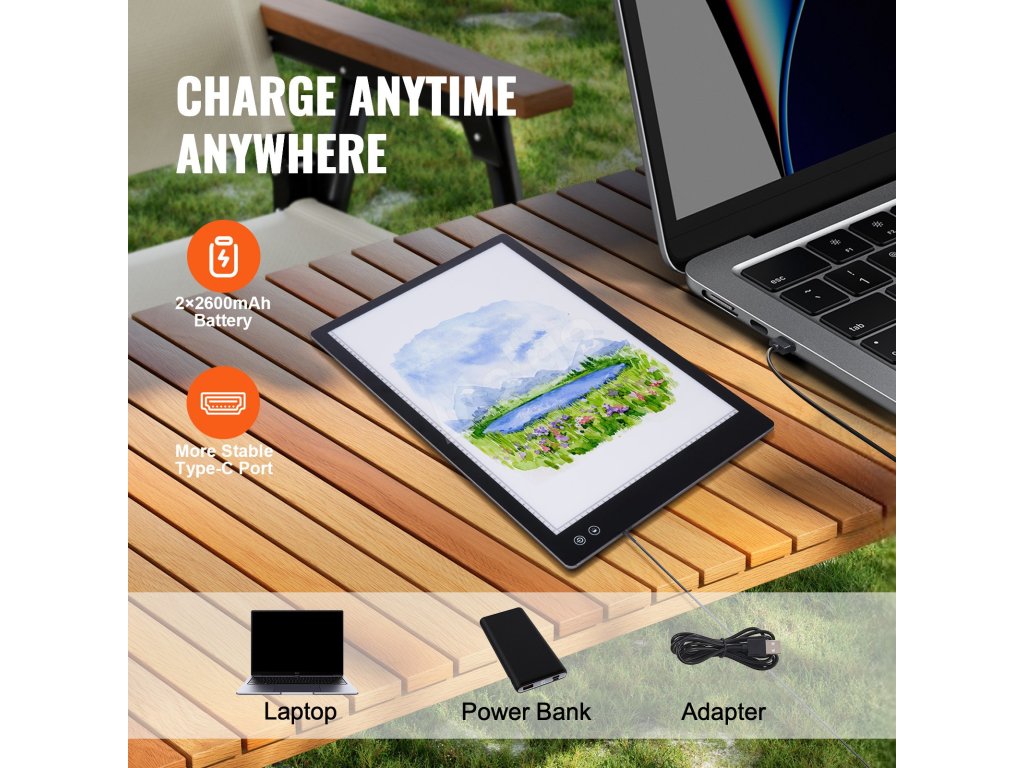Tato světelná tabule je dobíjecí, takže není třeba často měnit baterie ani napájecí kabely. Můžete začít tvořit kdykoli a kdekoli - ať už skicujete venku, pracujete ve studiu nebo hledáte inspiraci na cestách. Náš světelný box je připraven splnit všechny vaše potřeby.