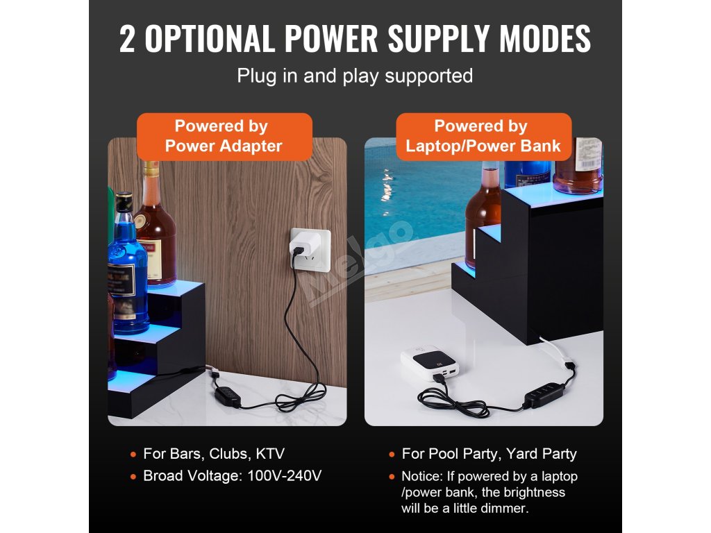 Náš LED osvětlený barový regál lze napájet z napájecího adaptéru a notebooku/napájecí banky. Scénáře použití tedy nejsou nijak omezeny. Osvětlený stojan na lahve si můžete užívat kdekoli.