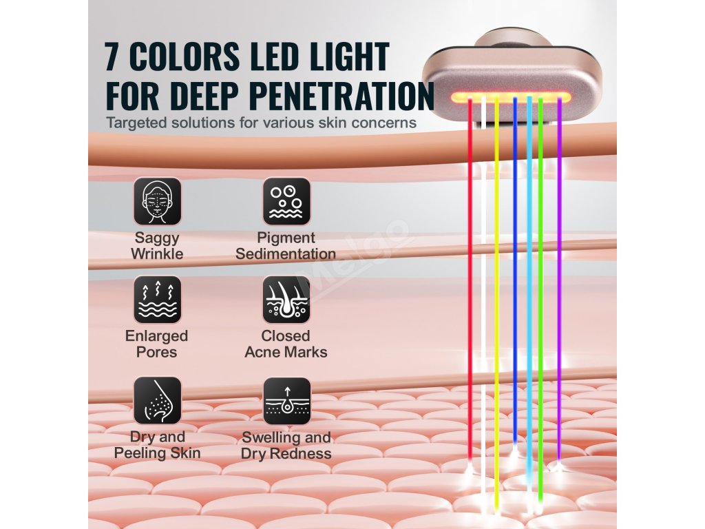 sedmibarevná světelná terapie poskytuje vaší pleti profesionální a příjemné přirozené světelné vlny, které zlepšují vstřebávání produktů péče o pleť. Červené světlo (630 nm) ; zelené světlo (520 nm) ; modré světlo (470 nm) ; žluté světlo (590 nm) ; fialové světlo (390 nm) ; azurové světlo (415 nm - 520 nm) ; bílé světlo.