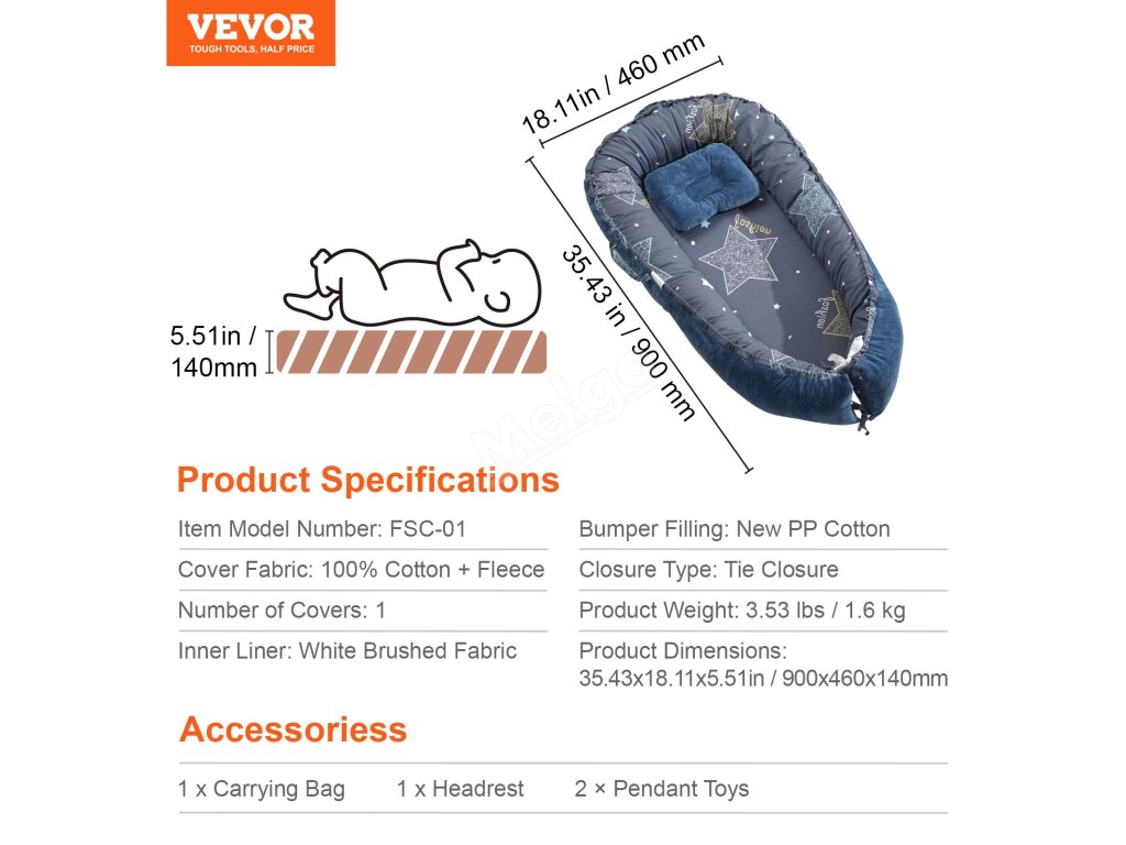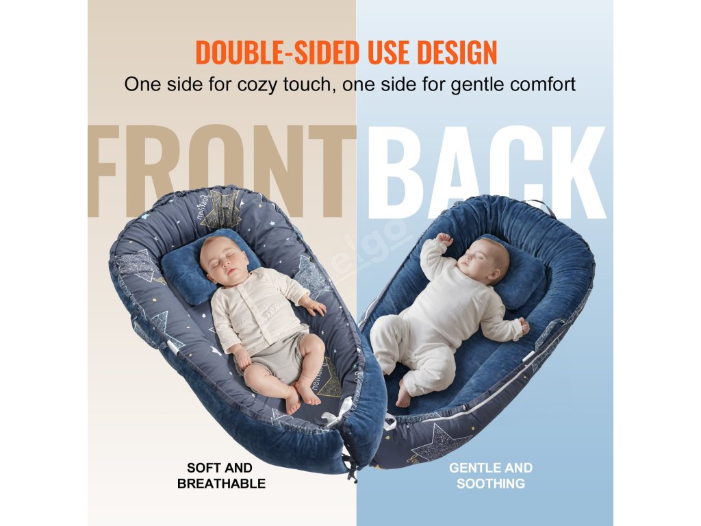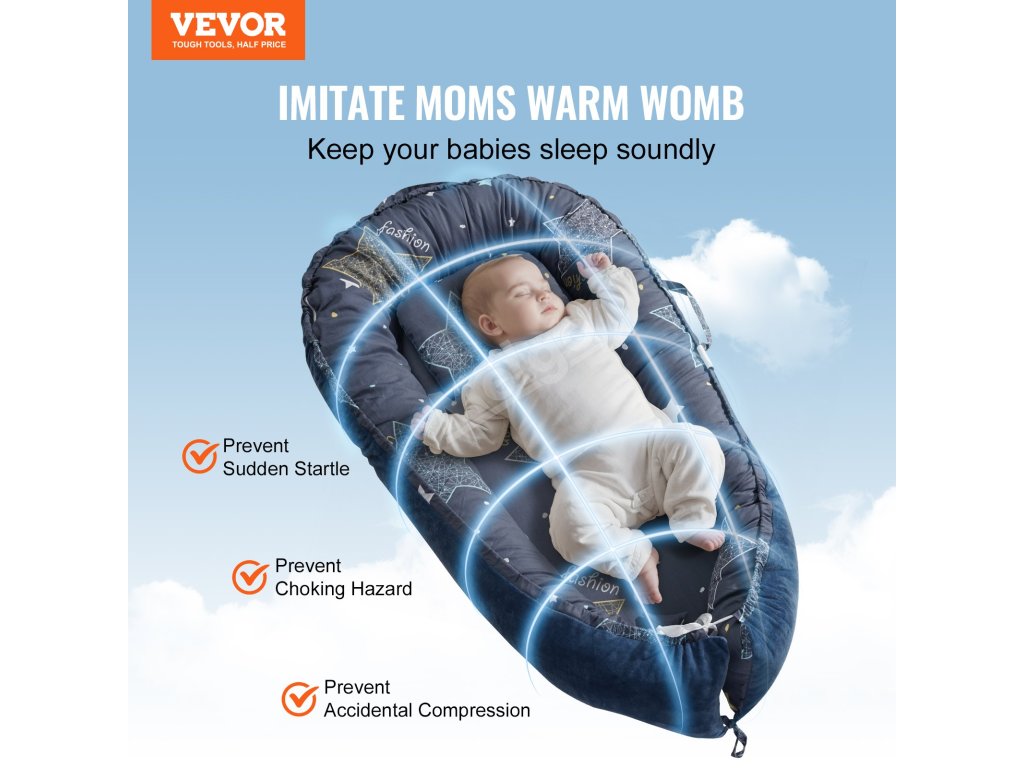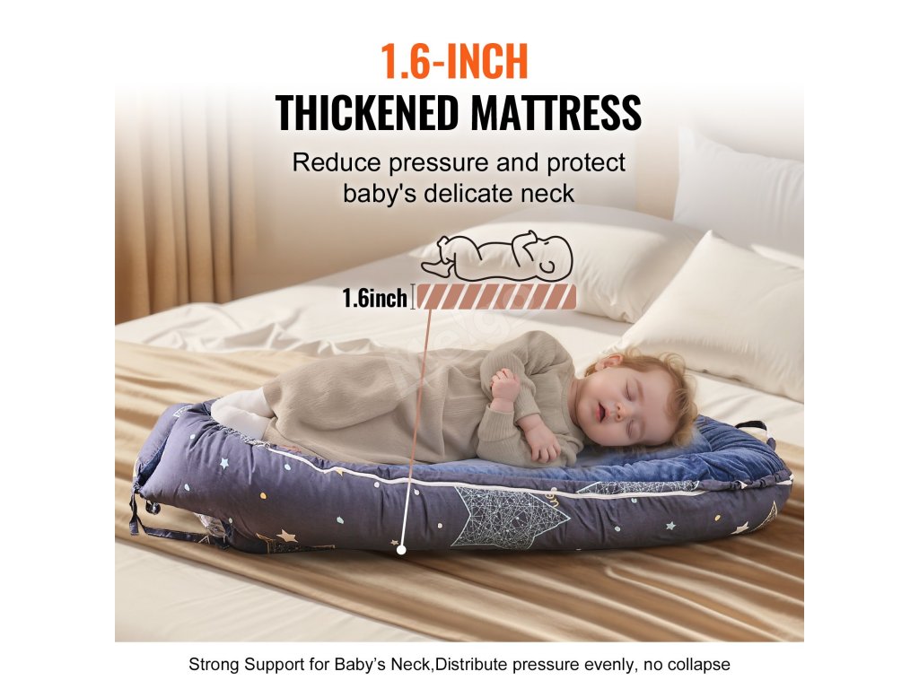 Dětské lehátko VEVOR má oboustranný design se 100% bavlněnou tkaninou, která je pro dítě měkká a jemná na dotek. Jeho měkká opěrka hlavy, 360° objetí a bezpečné nárazníky napodobují teplo a bezpečí maminčina objetí a zajišťují dítěti bezpečný a pohodlný spánek.