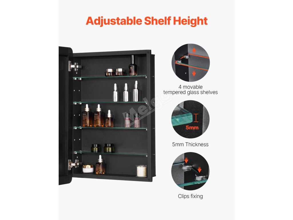 Zrcadlové police v lékárničce se snadno nastavují nahoru a dolů a poskytují individuální úložný prostor pro předměty všech velikostí - ideální pro vysoké lahvičky, malé kosmetické přípravky a vše mezi tím.
