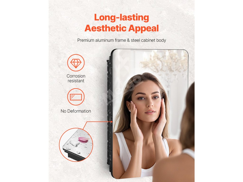 Tato zrcadlová koupelnová lékárnička je vyrobena z hliníku odolného proti korozi a odolá vlhkosti, chemikáliím i každodennímu opotřebení, čímž je zajištěna její dlouhotrvající odolnost a ochrana.
