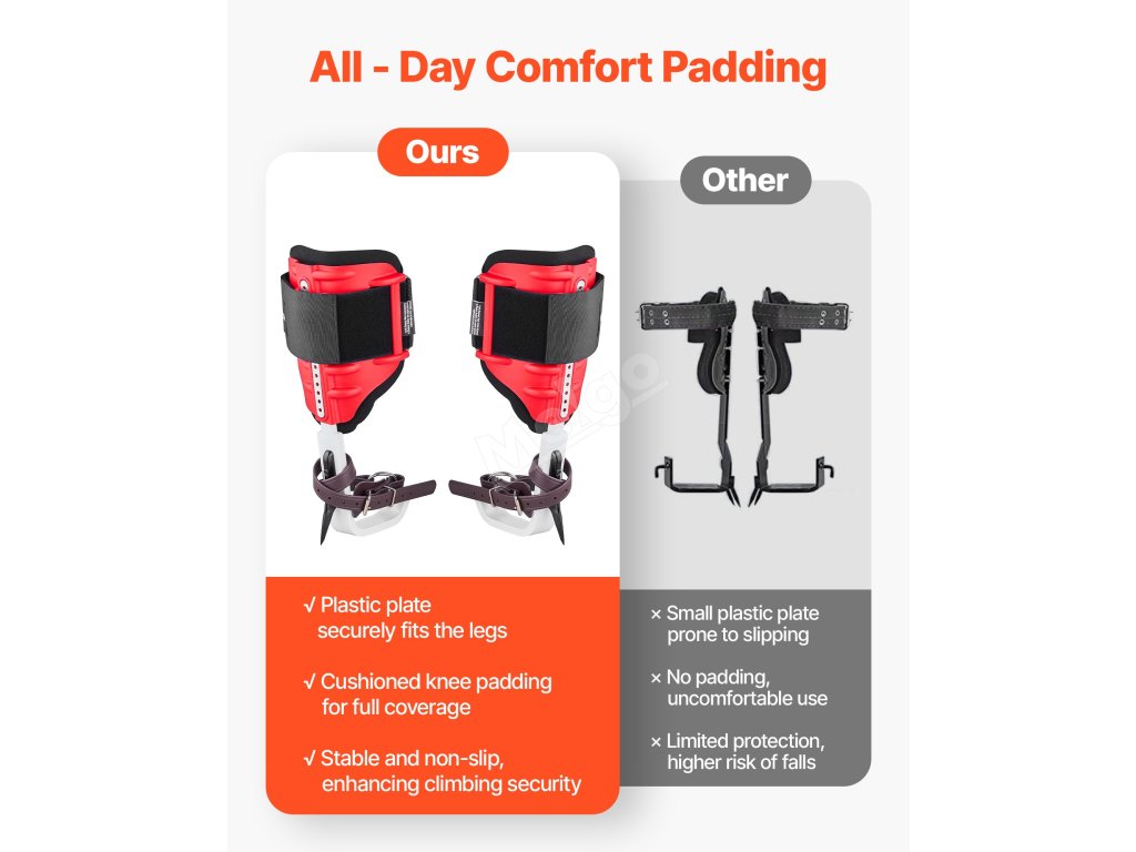Tyto hroty na lezení po stromech jsou vyrobeny s vysoce pevným rámem pro vyšší nosnost a mají ergonomické polstrované popruhy pro celodenní pohodlí. Jsou určeny pro úkoly ve vysokých nadmořských výškách, ideální pro lezení po stromech a sběr ovoce.
