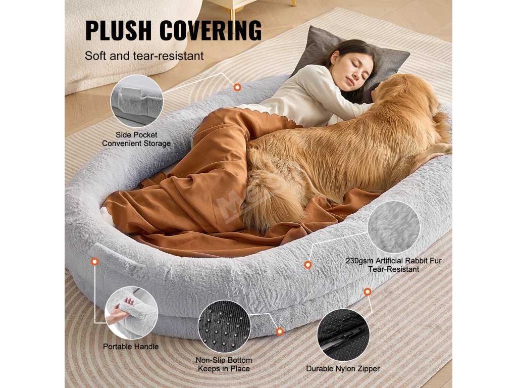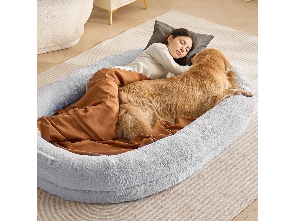 Tento lidský pelíšek pro dospělé psy, potažený měkkou umělou králičí kožešinou a podepřený pěnovou matrací, je robustní a odolný se stabilní oporou.