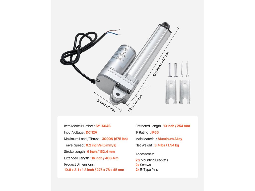 Lineární pohon VEVOR 12V nabízí výkonnou vertikální zvedací sílu 675 lbs a horizontální tlačnou sílu, což mu umožňuje zvládnout řadu středně náročných aplikací, jako jsou systémy sledování solárních panelů, zavlažovací systémy, mechanická zařízení nebo sekačky na trávu.