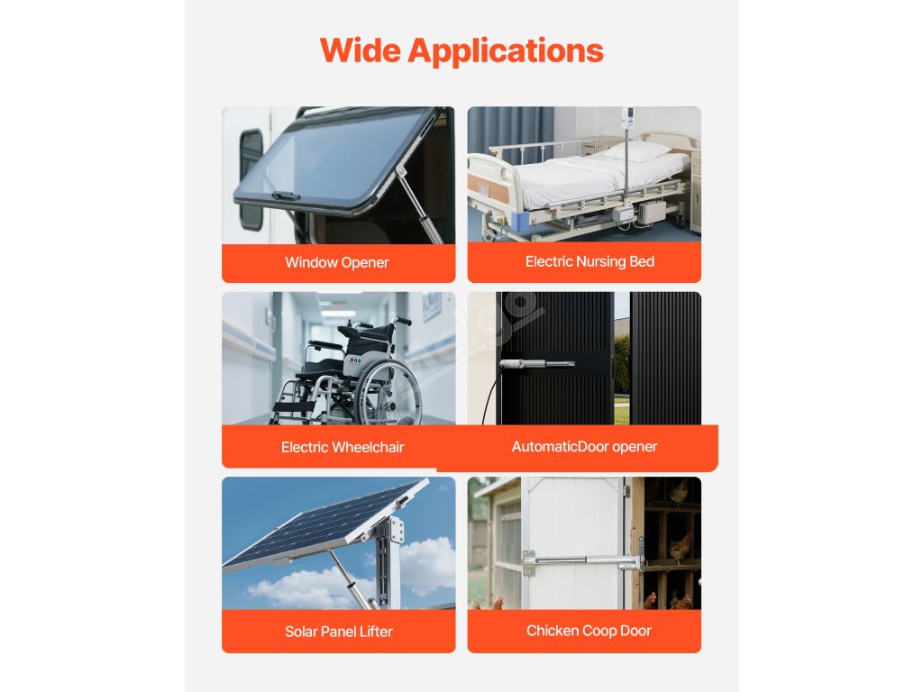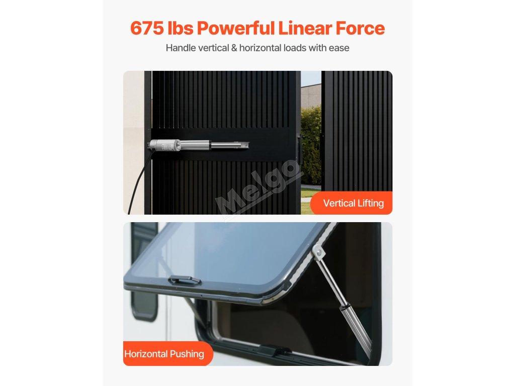 Lineární pohon VEVOR 12V nabízí výkonnou vertikální zvedací sílu 675 lbs a horizontální tlačnou sílu, což mu umožňuje zvládnout řadu středně náročných aplikací, jako jsou systémy sledování solárních panelů, zavlažovací systémy, mechanická zařízení nebo sekačky na trávu.