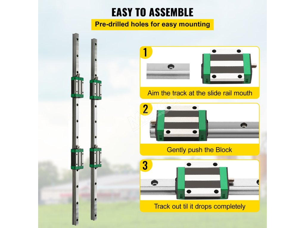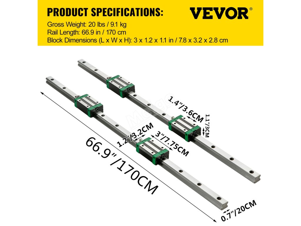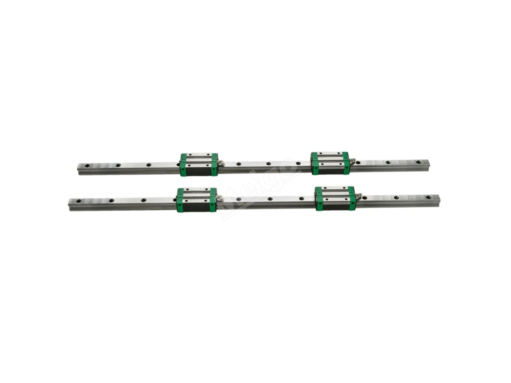 Sada lineárního vedení obsahuje 2 x 66,9 palce / 1700 mm dlouhé kolejnicové hřídele HSR20, 4 x ložiskové polštářové bloky a několik prachových zátek. Bloky jsou uvnitř opatřeny přesnými ložisky, která umožňují jejich volný posuv.