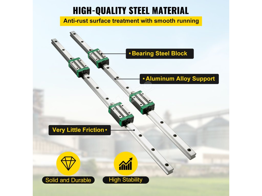 Tato ložisková lišta je vyrobena z vysoce kvalitního ocelového materiálu 55C. Povrchová úprava odolná proti korozi zajišťuje hladký chod. Ocelové bloky s kuličkovými ložisky GCr15 navíc mohou pracovat při vysokých teplotách a mají velmi nízké tření.