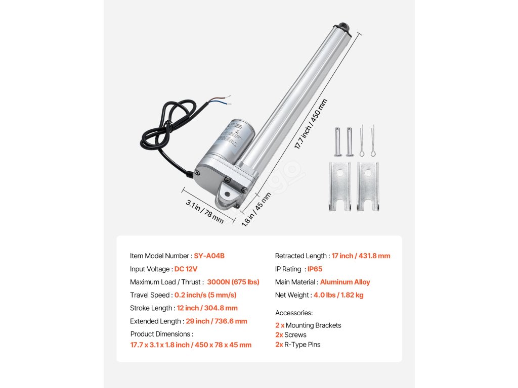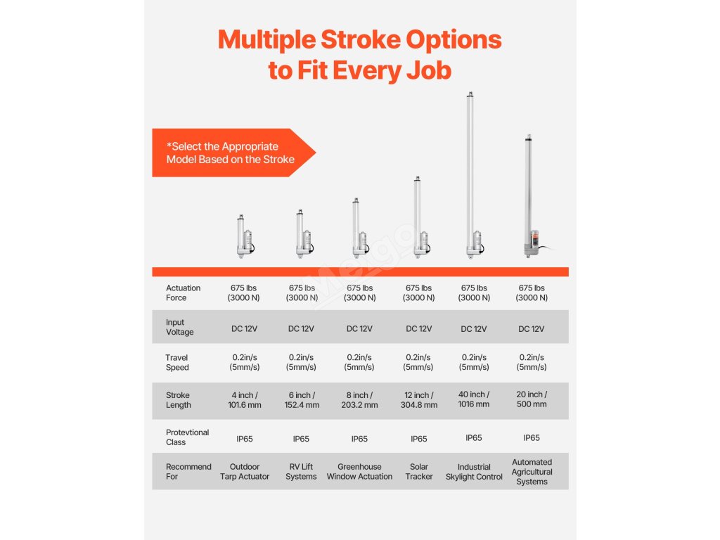 Lineární pohon VEVOR 12V nabízí výkonnou vertikální zvedací sílu 675 lbs a horizontální tlačnou sílu, což mu umožňuje zvládnout řadu středně náročných aplikací, jako jsou systémy sledování solárních panelů, zavlažovací systémy, mechanická zařízení nebo sekačky na trávu.