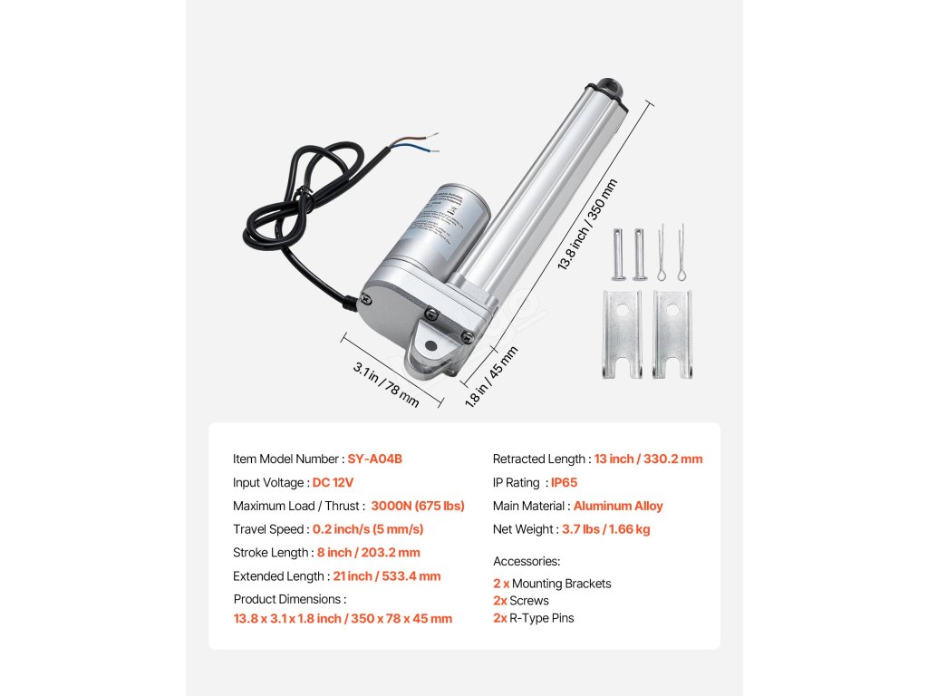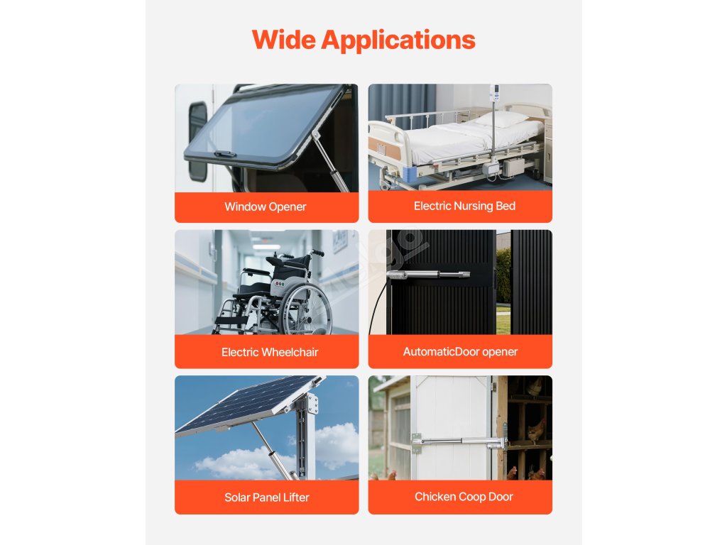 Lineární pohon VEVOR 12V nabízí výkonnou vertikální zvedací sílu 675 lbs a horizontální tlačnou sílu, což mu umožňuje zvládnout řadu středně náročných aplikací, jako jsou systémy sledování solárních panelů, zavlažovací systémy, mechanická zařízení nebo sekačky na trávu.
