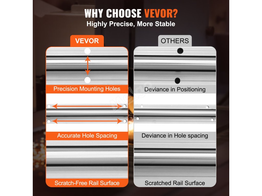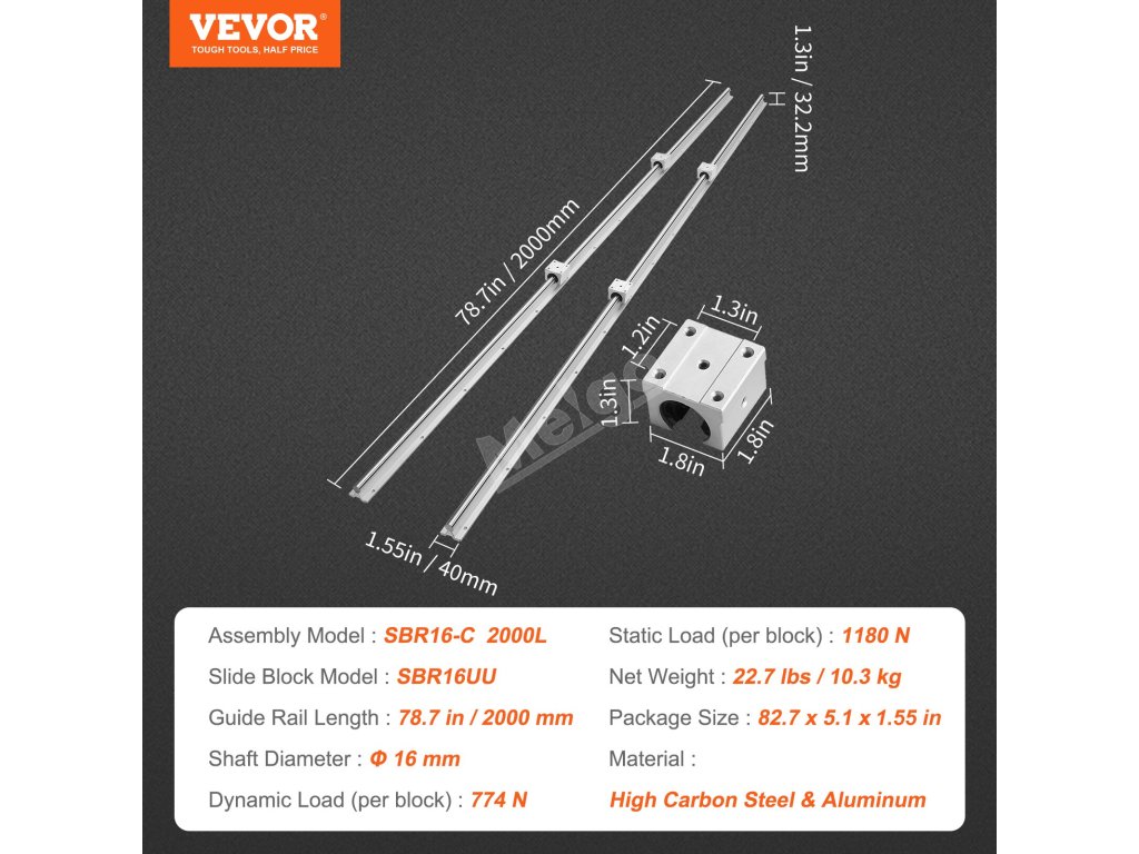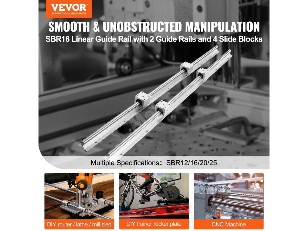 Vysoce kvalitní lineární vodicí lišta VEVOR SBR obsahuje 2 vodicí lišty a 4 posuvné bloky. Odolné hliníkové vodicí lišty mají přesný průměr a rozteč otvorů, zatímco posuvné bloky SBR využívají kuličková ložiska pro hladký a nerušený pohyb.