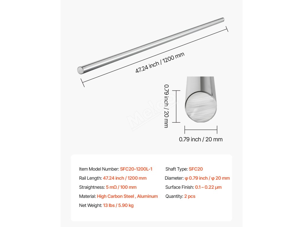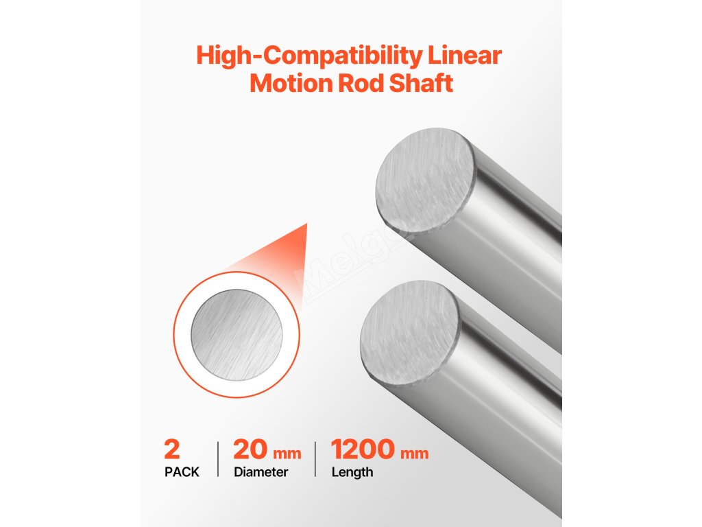 Obsahuje dvě lineární tyče o délce 1200 mm a průměru 20 mm pro potřeby průmyslové výroby. Naše tyče jsou vyrobeny z vysoce tvrdé uhlíkové oceli se šestistupňovým broušením a pozinkovanou povrchovou úpravou, odolávají korozi a zajišťují hladký posuv pro všechny kompatibilní lineární posuvné bloky.