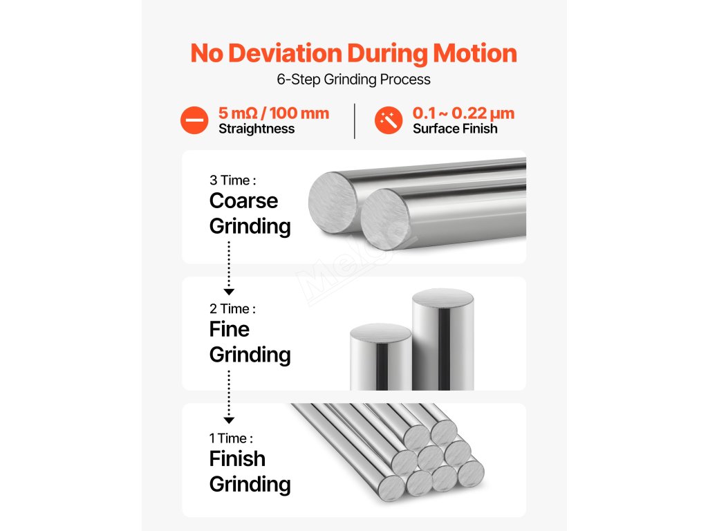 Díky povrchové úpravě 0,1-0,22 μm a přímce 5 mΩ a přesným montážním otvorům a roztečím otvorů poskytuje tato lineární hřídel trvale přesný pohyb na dlouhé vzdálenosti a opakovatelné polohování.