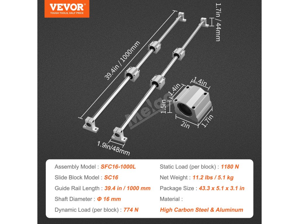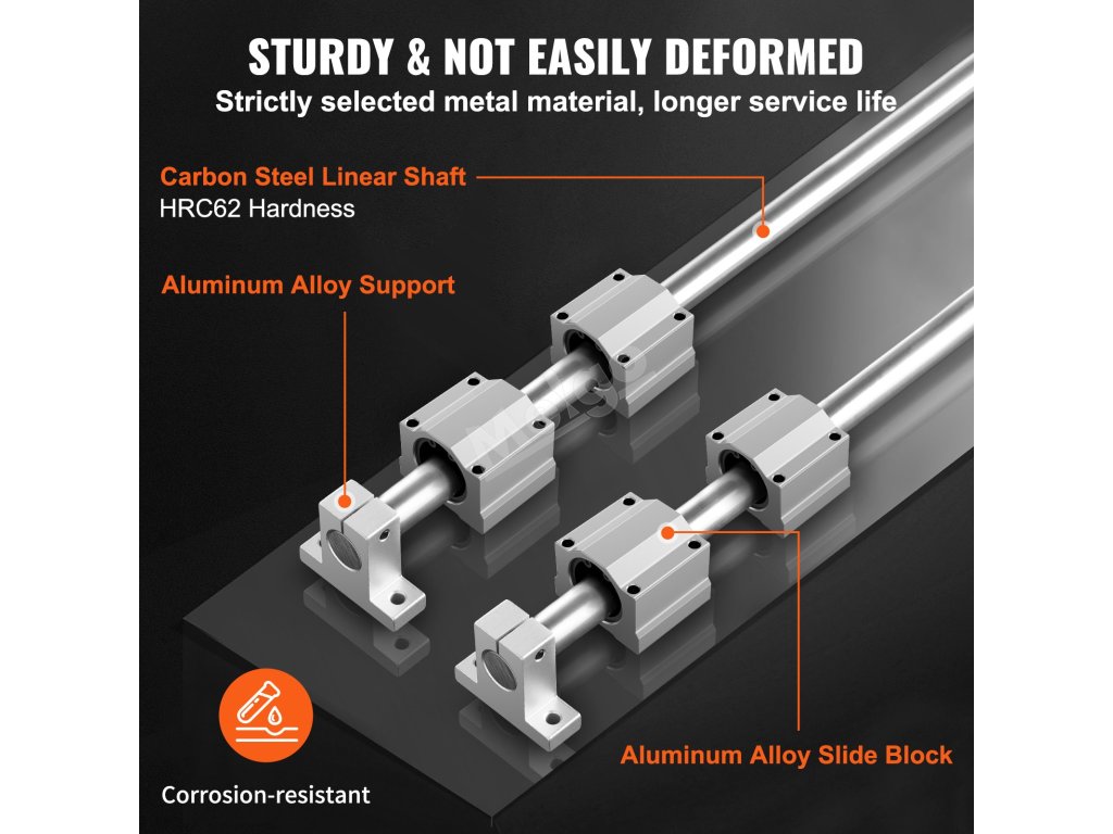 Lineární vodicí lišta VEVOR SFC obsahuje 2 vodicí lišty a 4 posuvné bloky. Odolné hliníkové vodicí lišty mají přesný průměr a rozteč otvorů, zatímco posuvné bloky SC používají kuličková ložiska pro plynulý a nerušený pohyb. K dispozici je více specifikací, které dokonale vyhovují vašim potřebám.