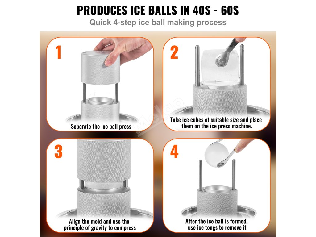 Lis na ledové koule využívá gravitaci a přirozenou tepelnou vodivost kovu k lisování kostek ledu a jejich krájení na správnou velikost. Výroba jedné ledové koule trvá 40-60 sekund, a pokud ji chcete znovu použít, namočte ji před dalším použitím do teplé vody.