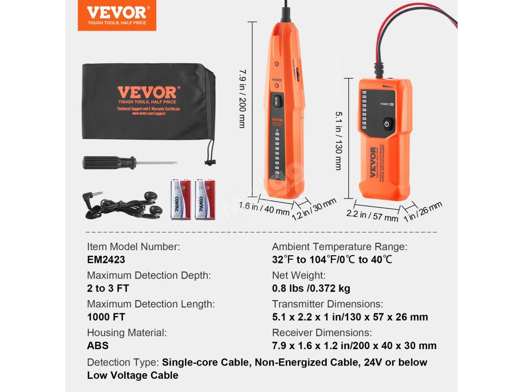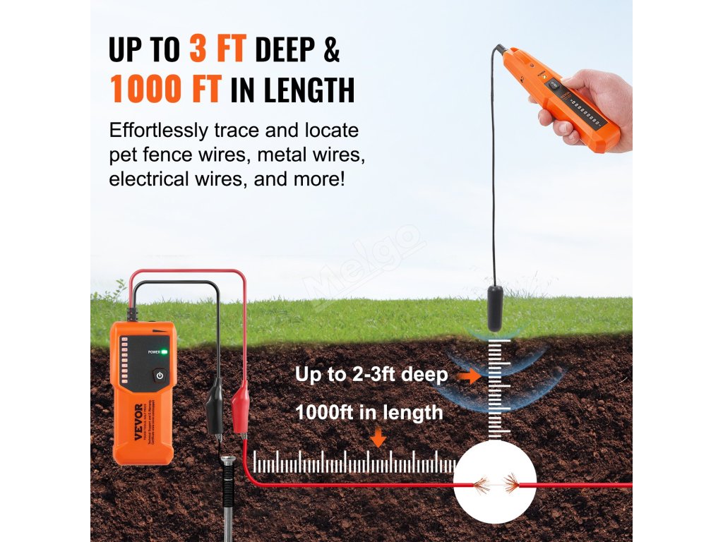 Náš lokátor podzemních kabelů má max. 3 stopy. A max. hloubku detekce 1000 stop. Detekční délka pro lokalizaci kabelů bez napětí a 24 V nebo nižšího nízkého napětí, pouze pro jednožilové kabely nebo paralelně vedené dvoužilové kabely. Snadno detekuje a opravuje poškozené kabely, čímž šetří váš čas a peníze!