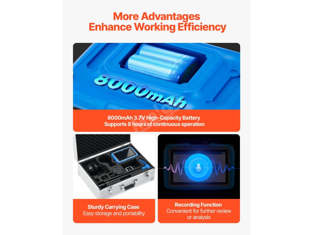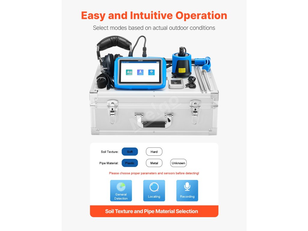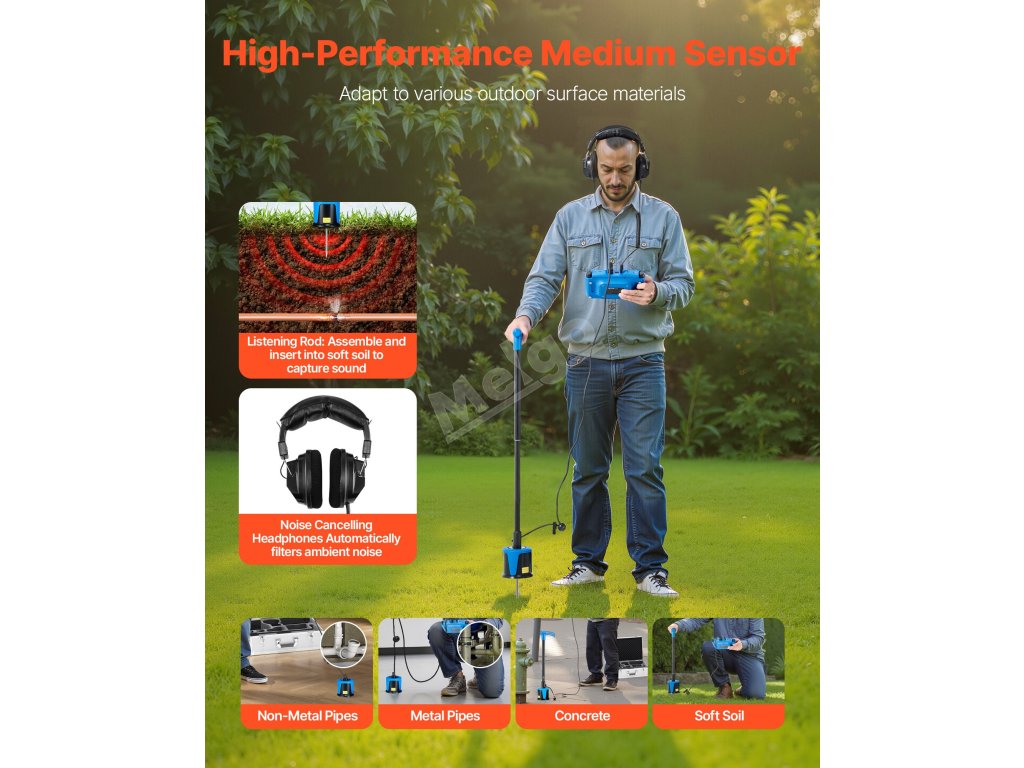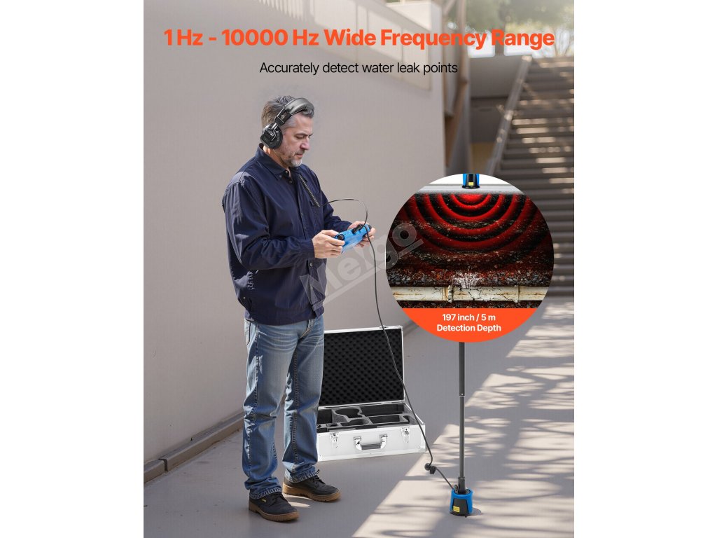 Detektor netěsností potrubí VEVOR nabízí široký frekvenční rozsah 1 Hz - 1000 Hz a hloubku detekce 16,4FT (5 m). Je vybaven citlivým středním senzorem, 3 poslechovými lištami, sluchátky s potlačením šumu, 7palcovým dotykovým displejem a vysokokapacitní baterií s kapacitou 8 000 mAh pro efektivní detekci úniků.