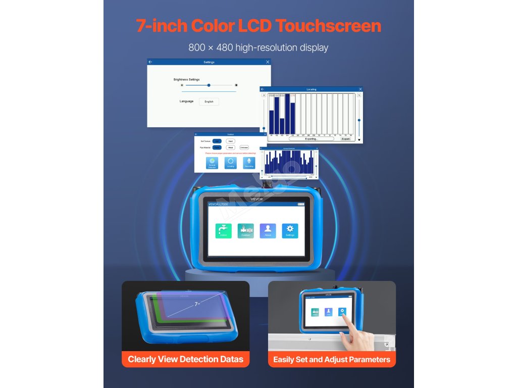 Náš přístroj pro detekci úniků vody má odolný kryt z ABS, 7palcový barevný dotykový displej LCD pro intuitivní ovládání, 8GB kartu SD pro ukládání dat a pevné pouzdro pro snadnou přepravu.