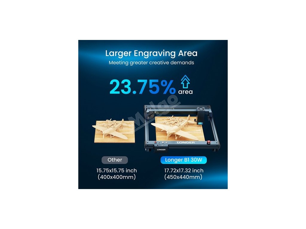 S pracovní plochou 450 x 440 mm budete moci gravírovat projekty velikosti A3. Nová 32bitová základní deska umožňuje pracovní rychlost 36 000 mm/min. Tiché ovladače TMC2009 vám navíc umožní pracovat v klidu a tichu na více než 1000 podporovaných materiálech. Laser LONGER B1 je vybaven robustním kovovým rámem, polohovací lištou pro zaostřování, koncovými spínači osy XY a osmi hlavními bezpečnostními kryty pro vaše pohodlí. Je také kompatibilní s řadou pokročilých řezbářských softwarů, jako je LaserGRBL nebo Lightburn, a nabízí několik možností přenosu.