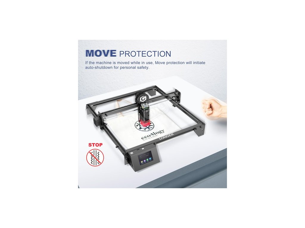 Laserová gravírka RAY5 10 W je vybavena funkcemi ochrany proti plameni, ochrany proti pohybu a ochrany proti pohybu. Pokud gravírka Ray5 během provozu zjistí náhodný plamen, ochrana proti plameni automaticky zastaví laser a vydá nepřetržitý zvukový signál. Při náhodném pohybu nebo naklonění gravírky se stroj automaticky vypne z důvodu bezpečnosti osob. A laser se automaticky vypne, když laserový modul zamrzne na dobu delší než 15 sekund.