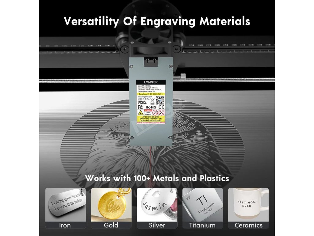 - Všestrannost v oblasti materiálů: laserový modul Longer Ruby se může pochlubit bezkonkurenčními možnostmi gravírování. Od kovů a slitin, jako je železo, měď, hliník, hořčík, zinek, zlato, stříbro a titan, až po další materiály, jako jsou oxidy kovů, galvanicky pokovené povrchy, ABS, inkousty a epoxidové pryskyřice, rytiny do kůže, keramické vzory a umělecké zpracování kamene. Longer Ruby má vše pokryté, bez ohledu na vaše potřeby.