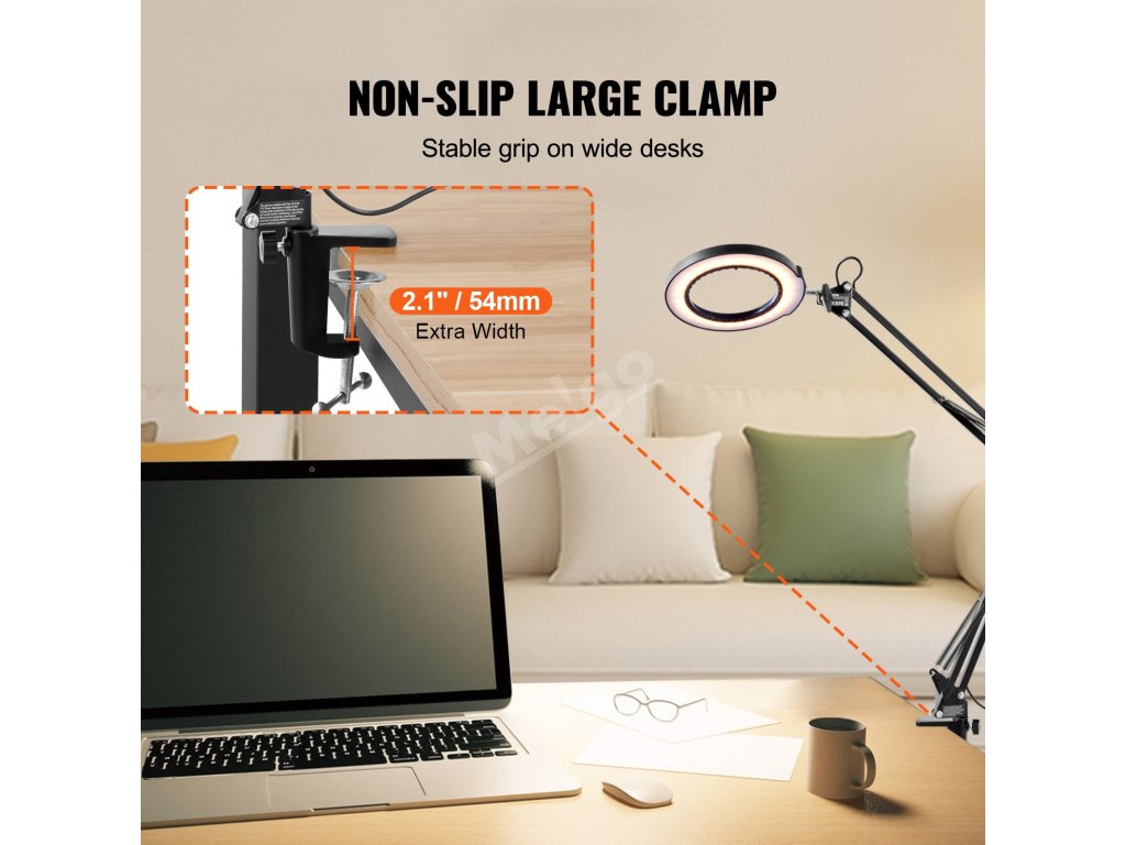 Převezměte kontrolu nad osvětlením! Větší svorka se hodí na více stolů různých velikostí, je flexibilnější a pohodlnější. Tato konstrukce umožňuje pevnější připevnění lupy se světlem k okraji stolu, což zvyšuje stabilitu a bezpečnost.