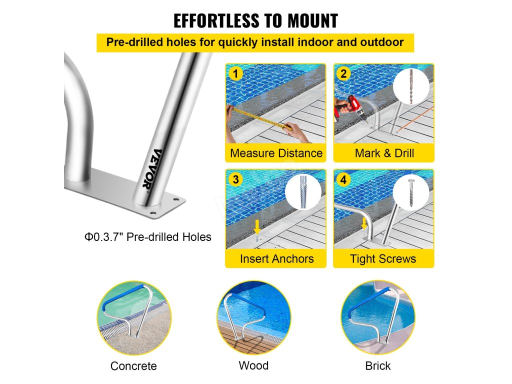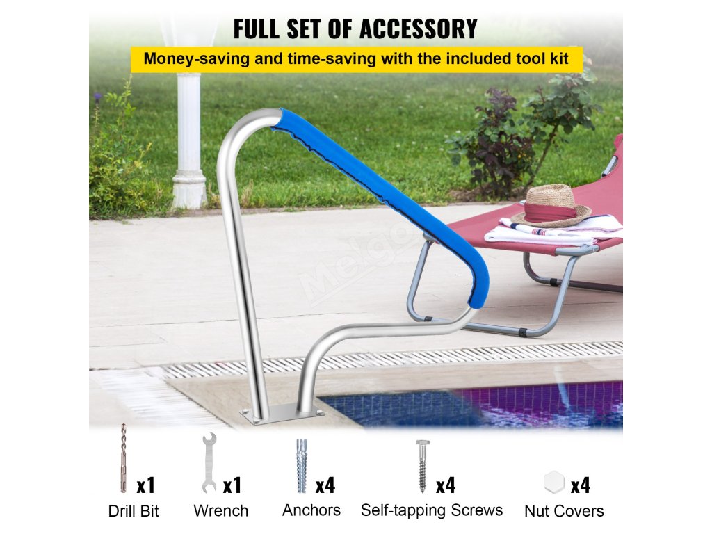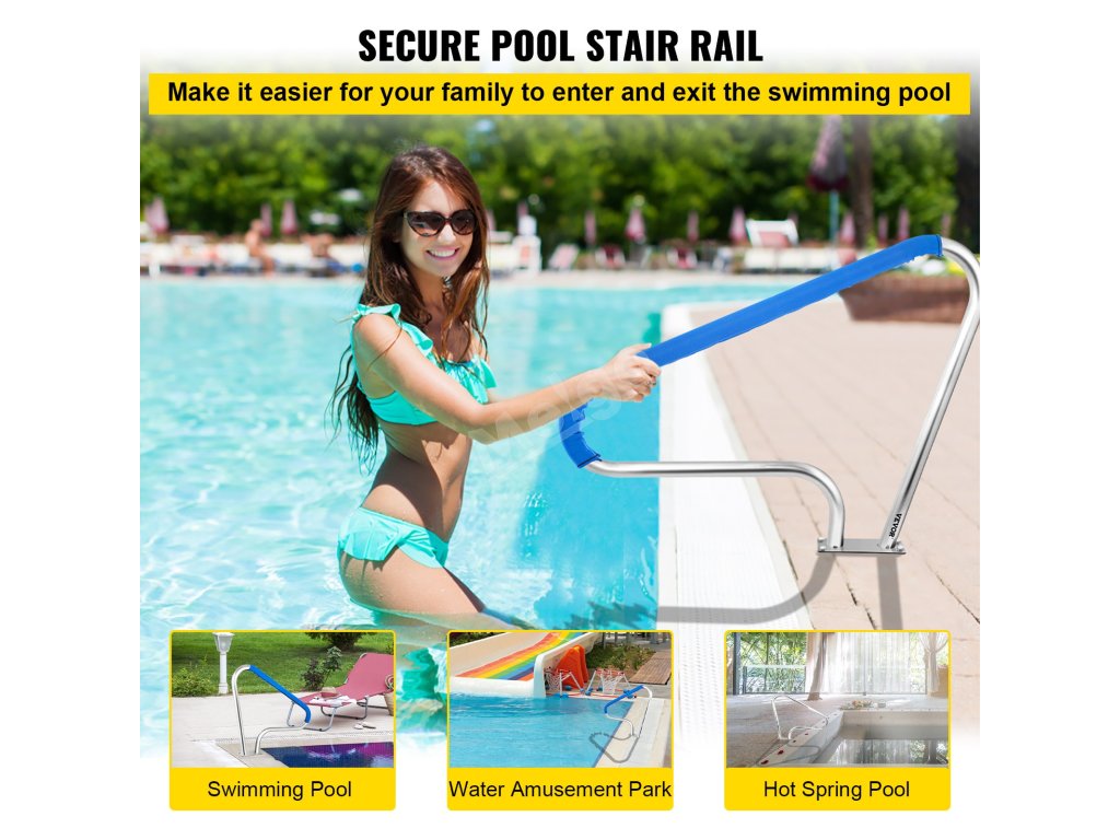Schodišťové zábradlí k bazénu je navrženo tak, aby vám pomohlo snadno a bezpečně vstoupit do bazénu a vystoupit z něj. Bazénové zábradlí má uživatelsky přívětivý design se 3 oblouky pro pohodlné uchopení.