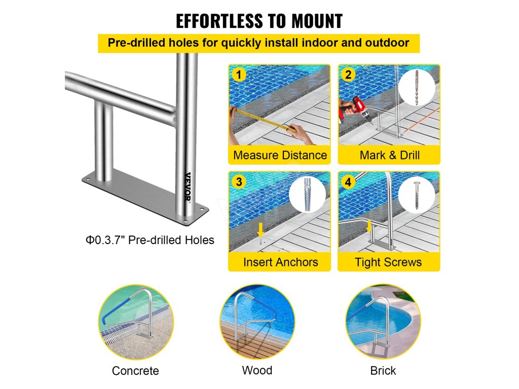 Zábradlí pro bazény v zemi je vyrobeno z nerezové oceli 304 s velkou základovou deskou, která umožňuje unést až 250 kg zátěže. Poskytne vám báječný zážitek.