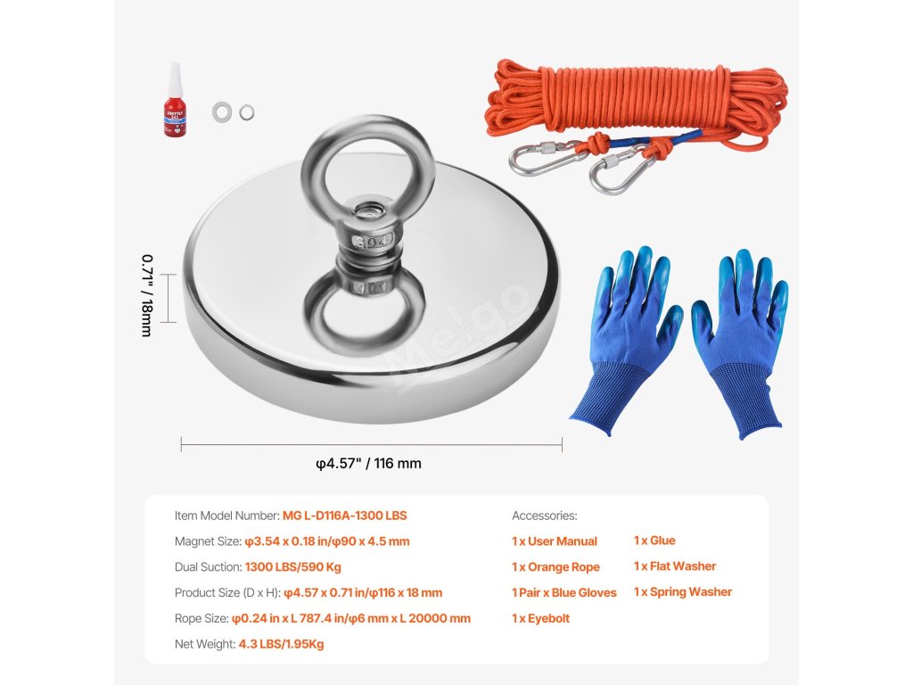 Tato magnetická rybářská sada obsahuje vysoce kvalitní neodymové magnety N35, které nabízejí silnou tažnou sílu až 1300 LBS/590 Kg. Dodává se s kompletní sadou příslušenství. Díky dvouvrstvé ochraně proti korozi a kompaktnímu designu se snadno přenáší a je ideální pro různá outdoorová dobrodružství.