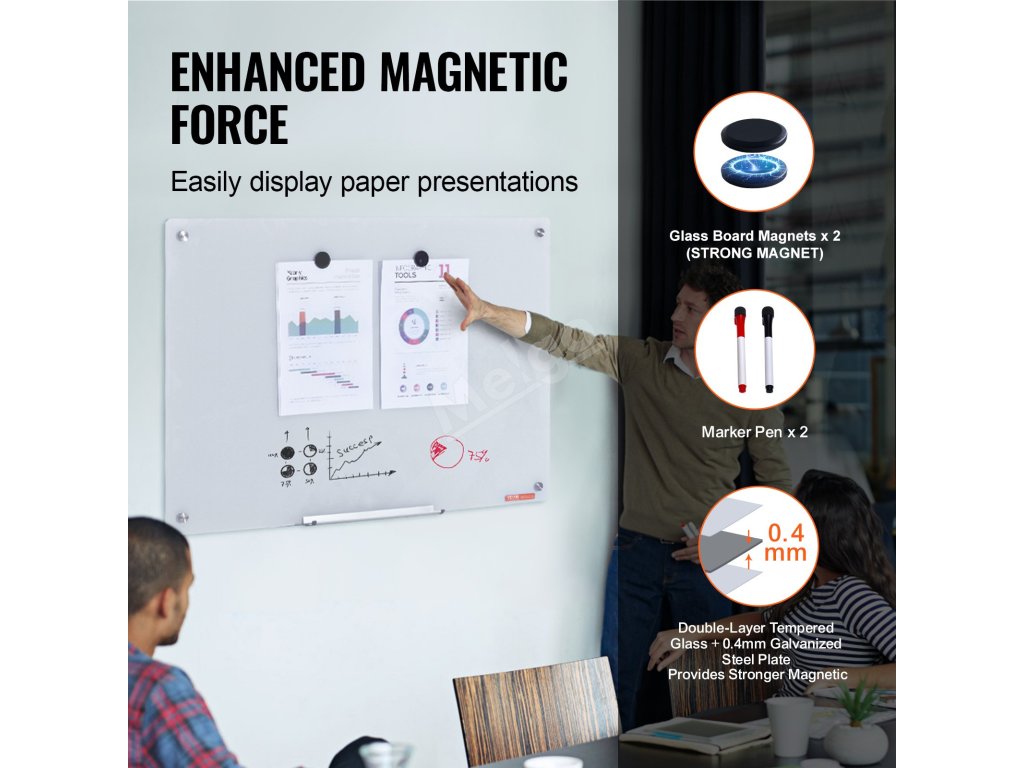 Vyrobeno z tvrzeného skla, odolného proti rozbití, poškrábání a skvrnám. Pozinkovaný plech o tloušťce 0,4 mm pro zvýšenou magnetickou pevnost, umožňující snadné zavěšení dokumentů a složek pro prezentace. Jeho elegantní bezrámový design dodá vašemu prostoru jedinečný středobod!