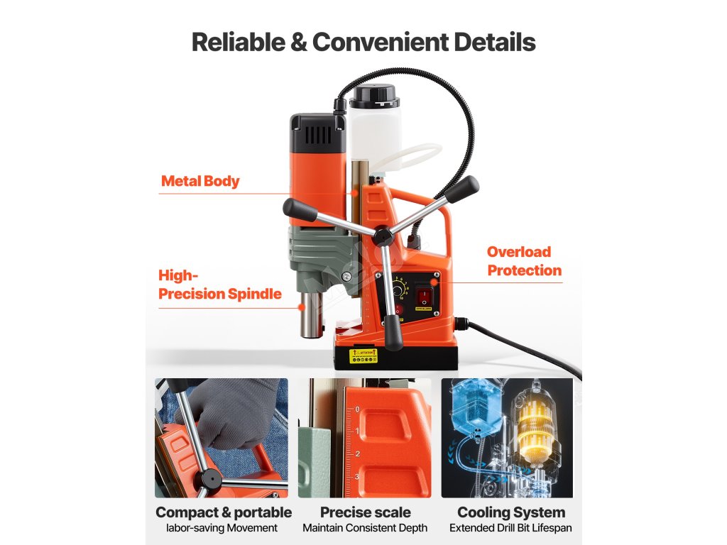 Kovová konstrukce magnetické vrtačky zaručuje stabilitu a odolnost při náročném používání. Odolává náročným pracovním podmínkám a zajišťuje dlouhodobé a spolehlivé vrtání.