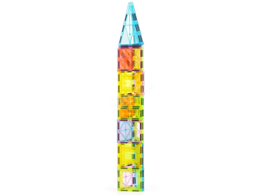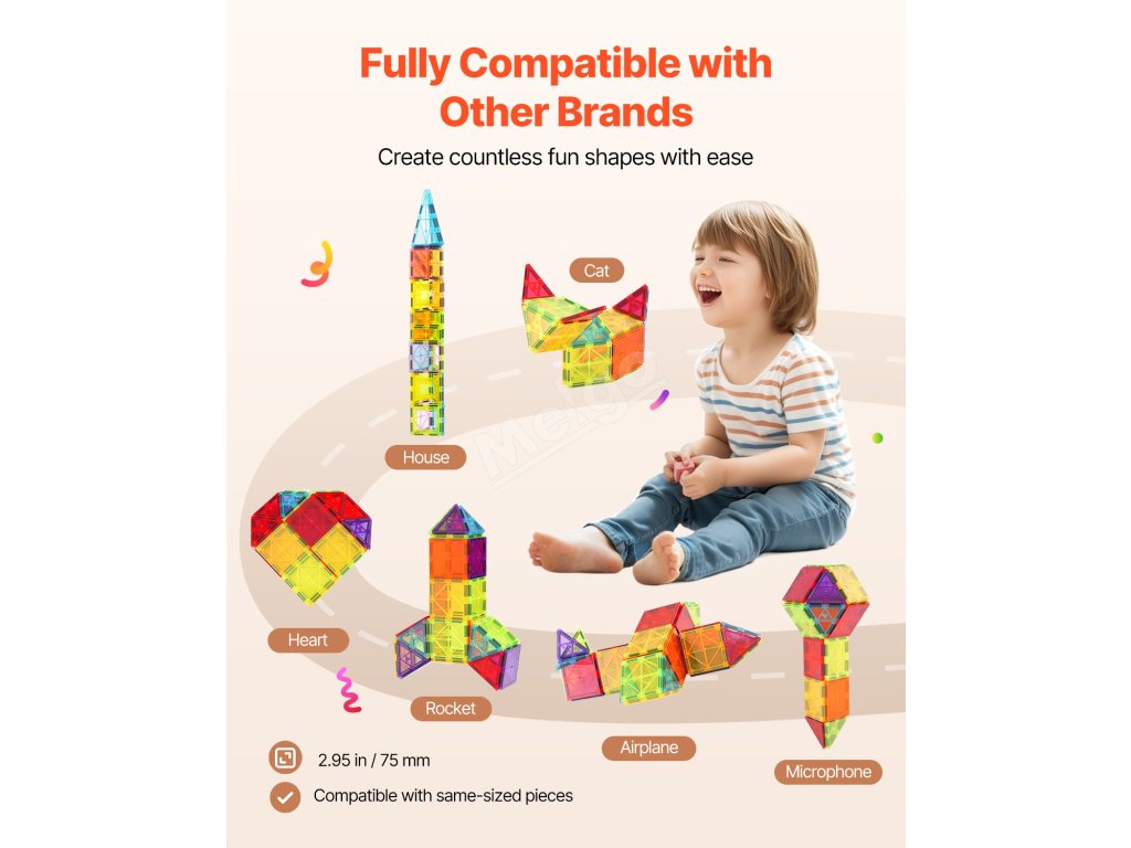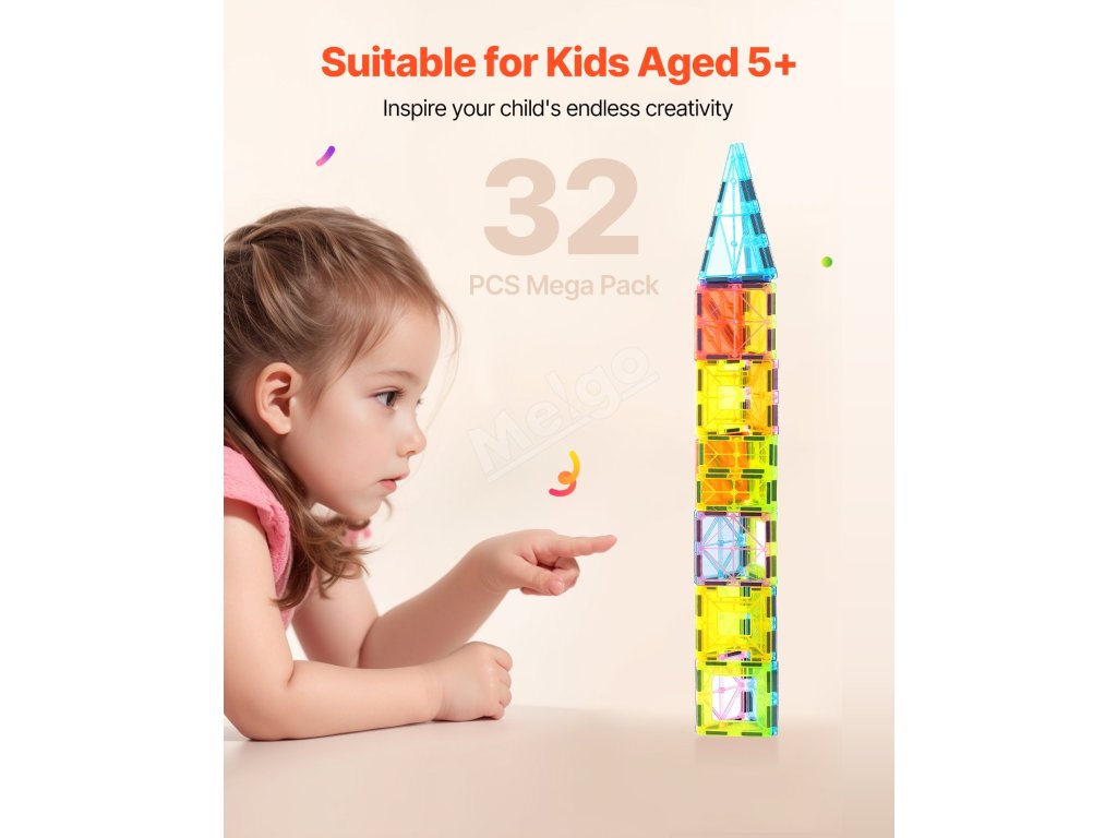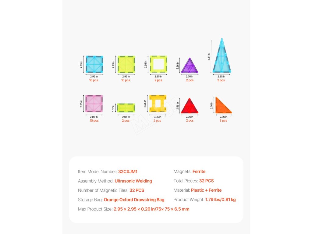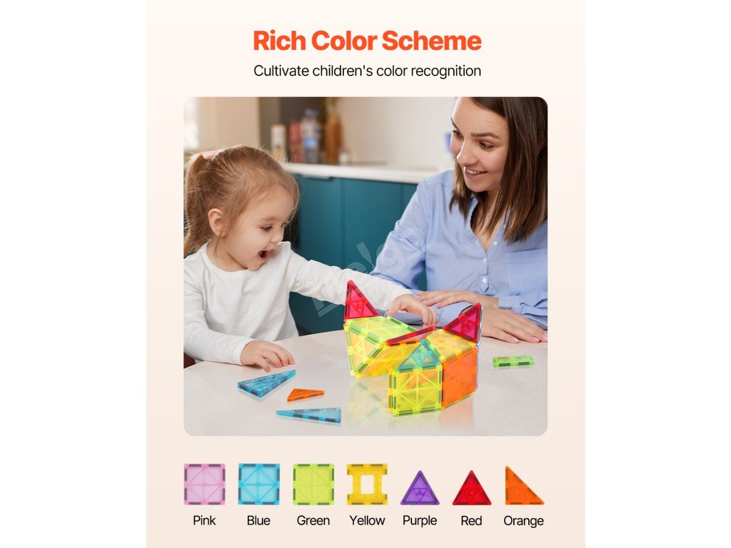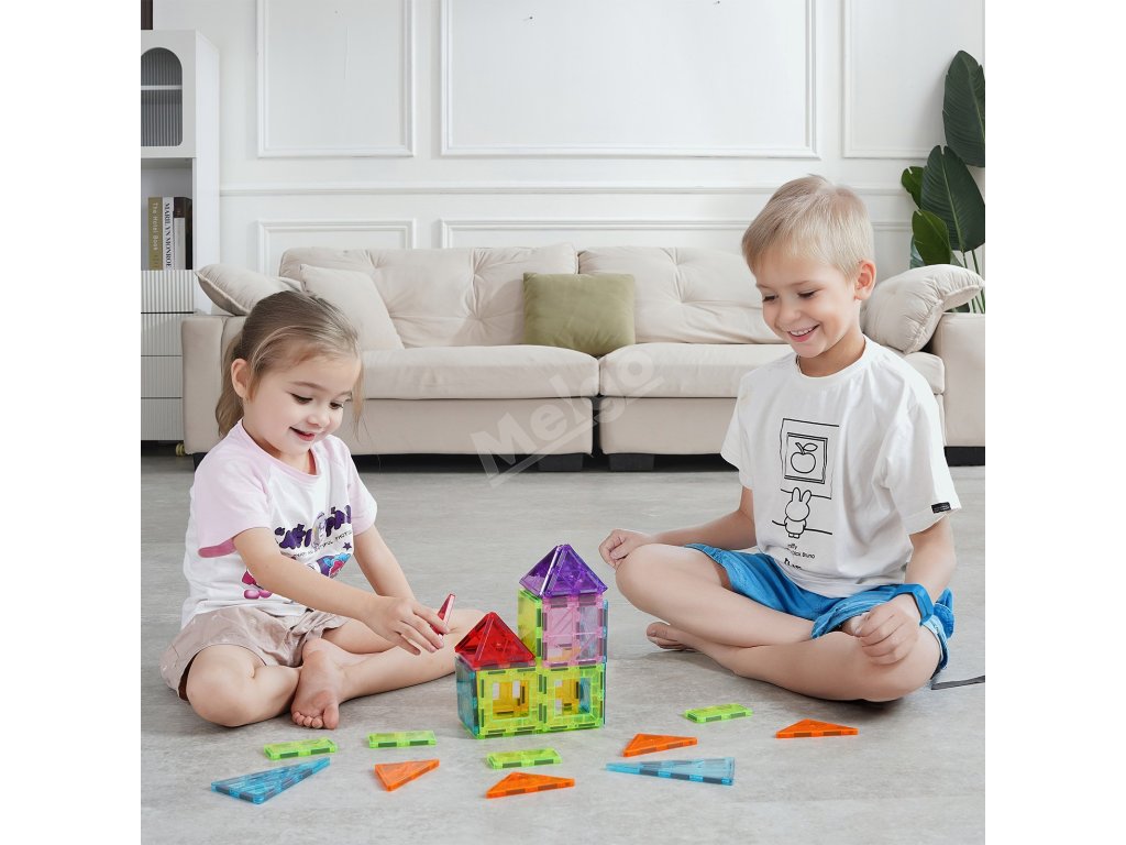Tyto magnetické dlaždice jsou vyrobeny z bezpečných a odolných materiálů se silnějšími magnety, které dětem umožňují snadno vytvářet různé tvary a textury. Tato sada je ideální pro učení tvarů, barev, kombinací a základních stavebních dovedností a poskytuje nekonečné množství zábavy a možností.