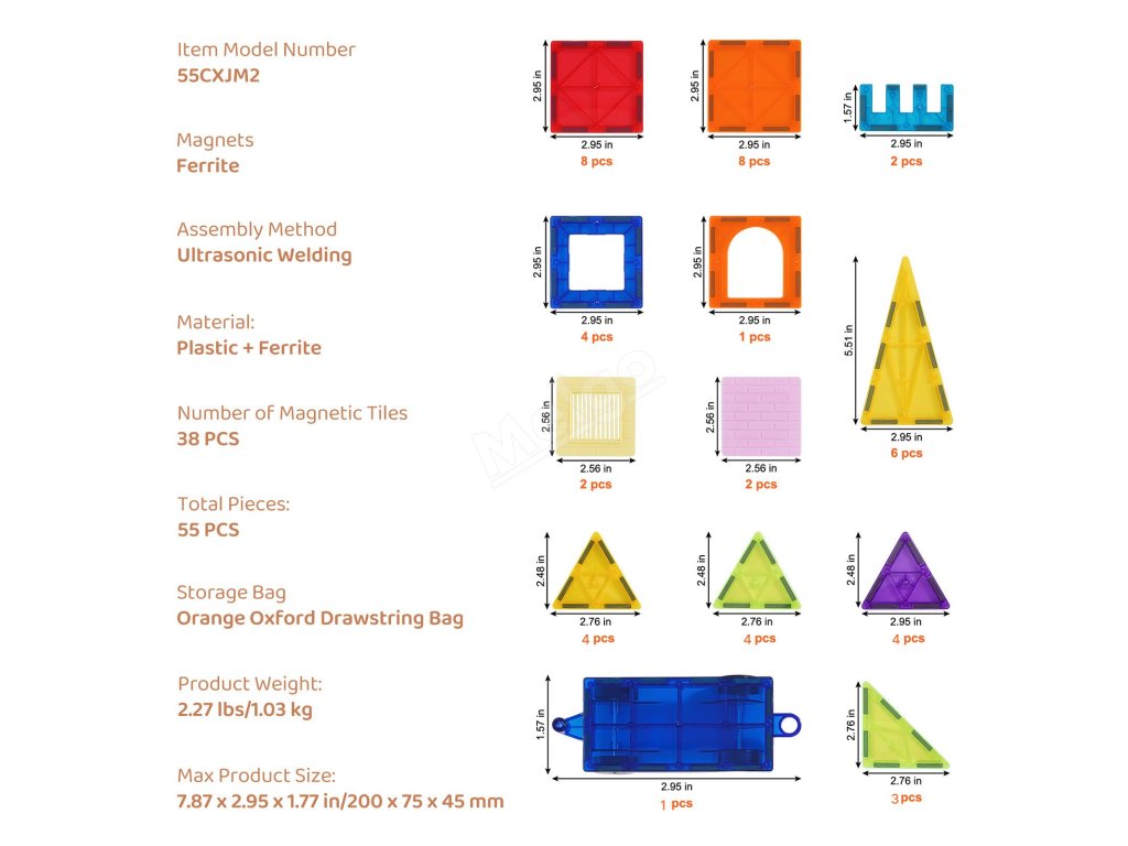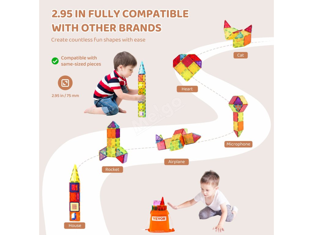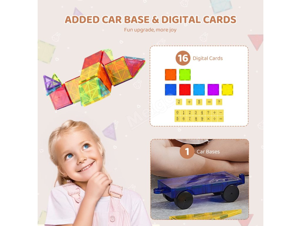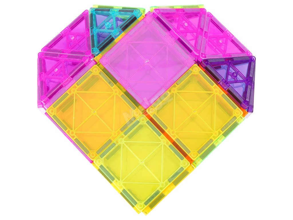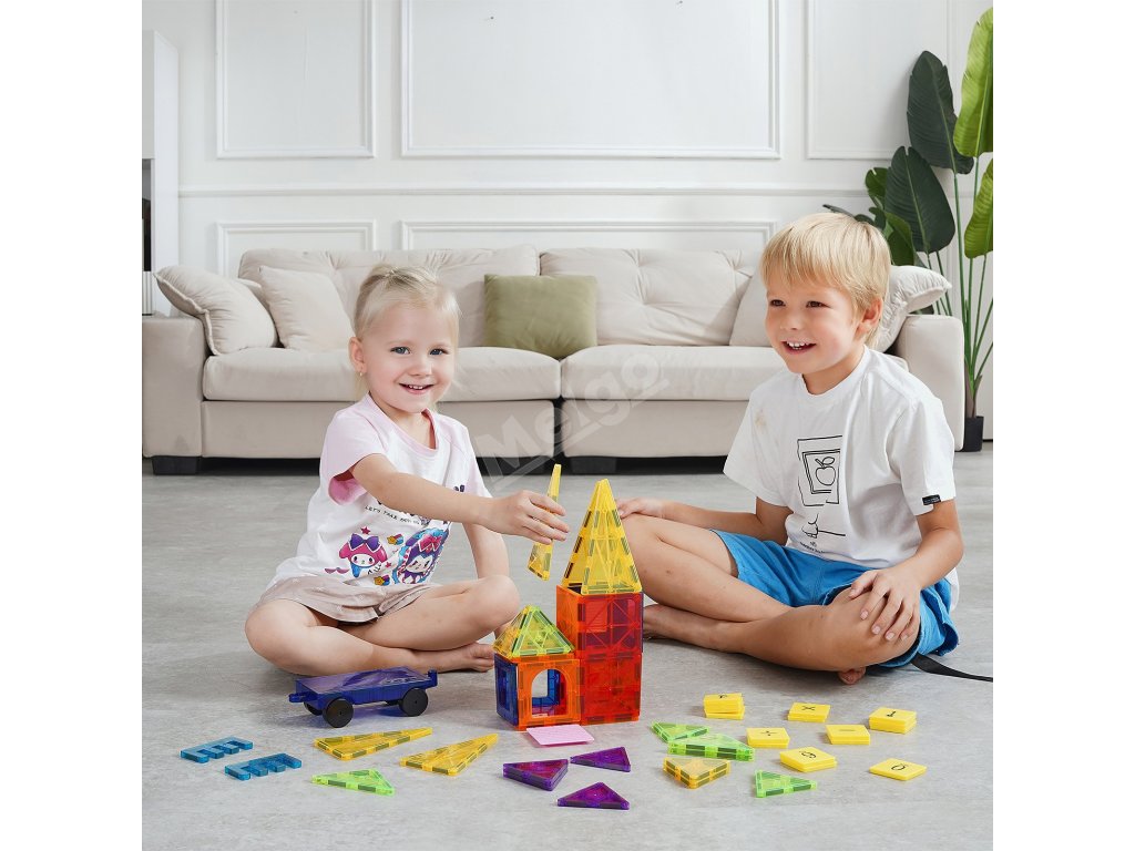 Tyto magnetické dlaždice jsou vyrobeny z bezpečných a odolných materiálů se silnějšími magnety, které dětem umožňují snadno vytvářet různé tvary a textury. Tato sada je ideální pro učení tvarů, barev, kombinací a základních stavebních dovedností a poskytuje nekonečné množství zábavy a možností.