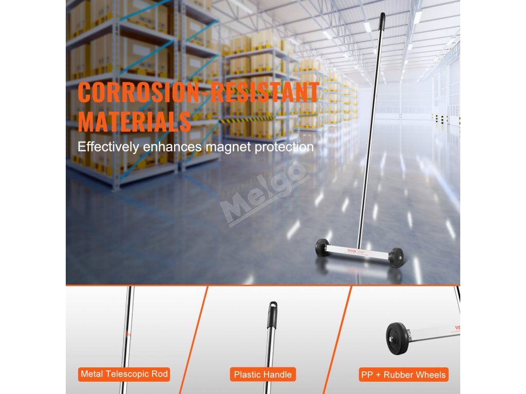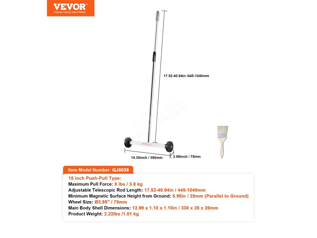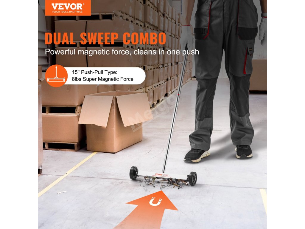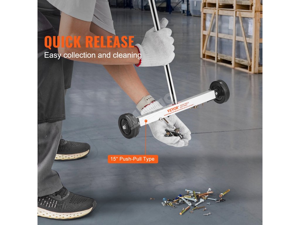 Tento 15'' mobilní magnetický zametač s tlačením je vybaven magnety, které utáhnou až 8 liber (3,6 kg) a rychle posbírají přebytečný kovový odpad, kdekoli je potřeba.