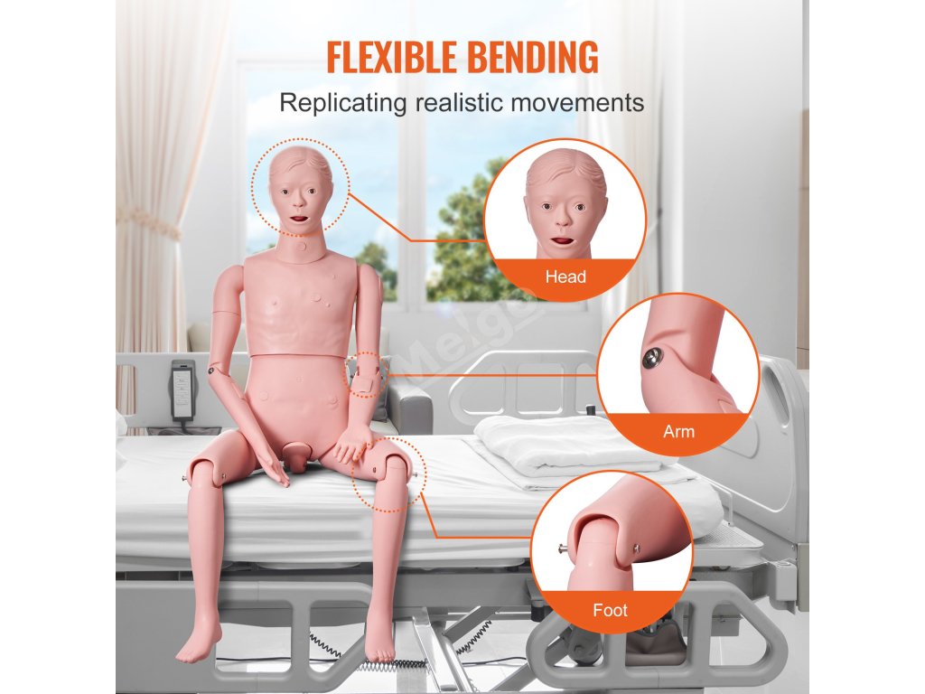 Končetiny této figuríny pro péči o pacienty jsou realisticky ohýbatelné, což umožňuje různé polohy a simulaci činností, jako je koupání a převlékání pacientů upoutaných na lůžko.