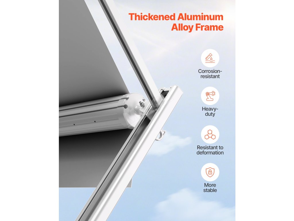 Nabízíme odolnou markýzu pro obytné vozy s vylepšenou 18oz čtyřvrstvou PVC vinylovou tkaninou, která je navržena tak, aby odolala proměnlivému počasí. Zesílený rám z hliníkové slitiny je vodotěsný, odolný proti korozi a zajišťuje dlouhodobou stabilitu a trvanlivost.