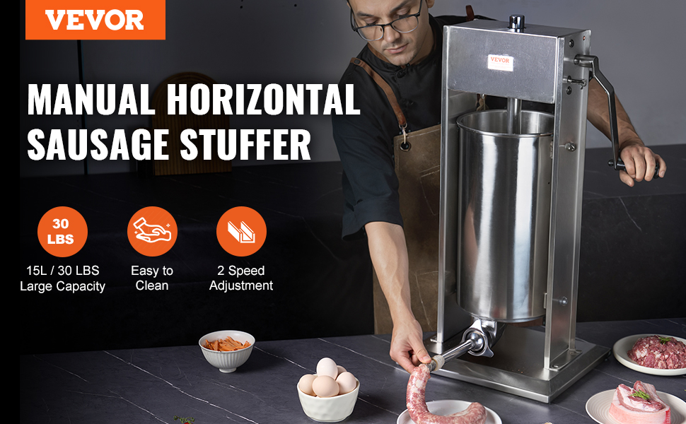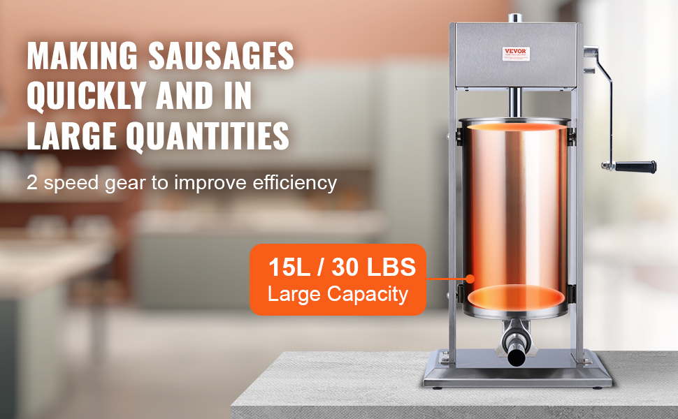 Tato plnička klobás o objemu 15 l/30 lbs je vybavena 2 odvzdušňovacími ventily, které umožňují výrobu klobás, které jsou pevně zabalené s minimem vzduchových bublin. Při plnění párků můžete nastavit rychlou nebo pomalou rychlost, což zajišťuje efektivní provoz. Je ideální pro komerční použití v supermarketech, restauracích apod.