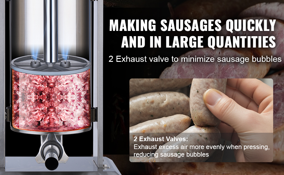 2 nastavení rychlosti umožňují libovolně regulovat rychlost podle podmínek výroby klobás, čímž je zajištěna optimální struktura klobás. Konstrukce se 2 výfukovými ventily vypuzuje přebytečný vzduch, čímž omezuje tvorbu bublin v klobásách.