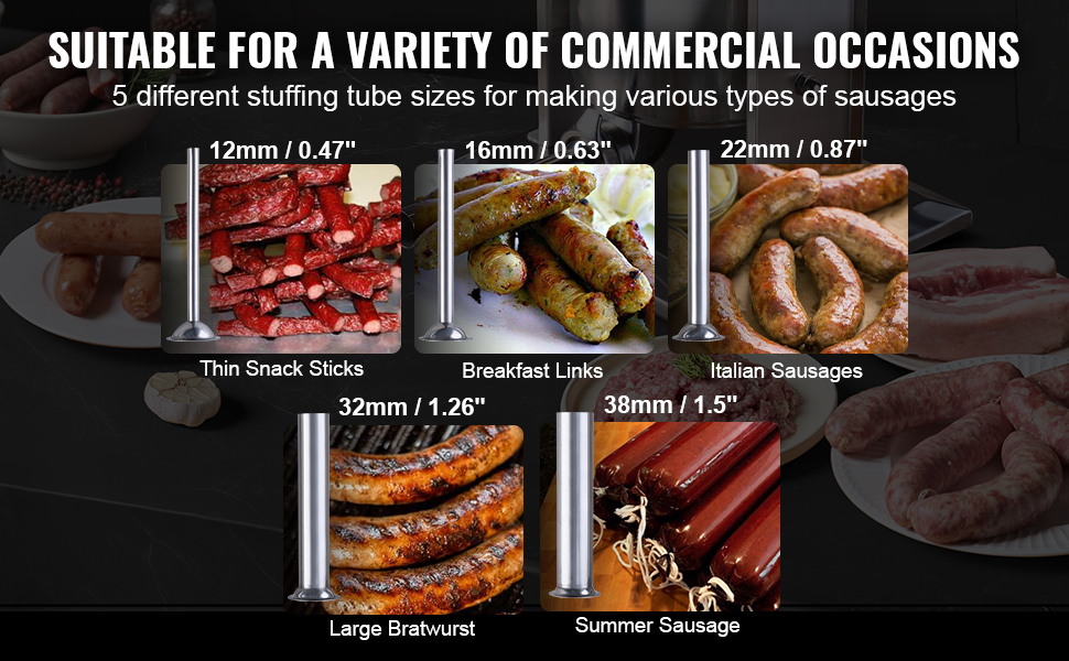 Obsahuje 5 trubek na výrobu klobás různých průměrů, které jsou vhodné pro použití v kuchyních, barech, restauracích a potravinářských provozech.