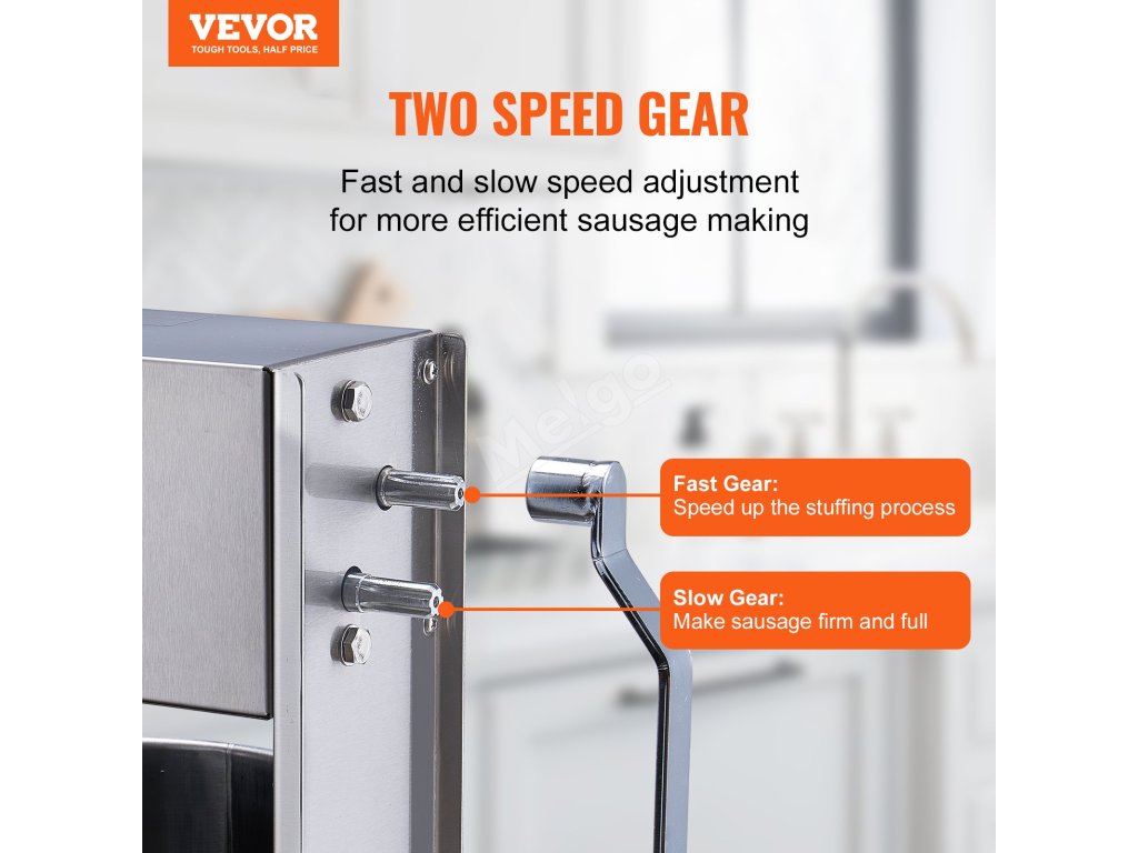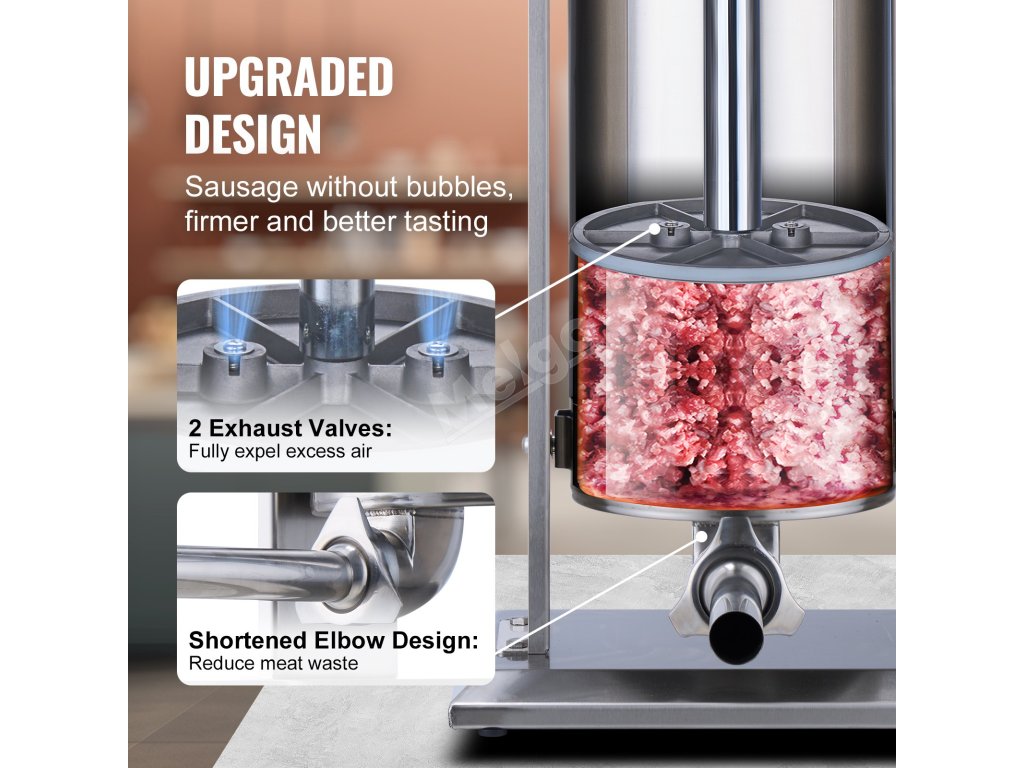 Tato plnička klobás o objemu 15 l/30 lbs je vybavena 2 odvzdušňovacími ventily, které umožňují výrobu klobás, které jsou pevně zabalené s minimem vzduchových bublin. Při plnění párků můžete nastavit rychlou nebo pomalou rychlost, což zajišťuje efektivní provoz. Je ideální pro komerční použití v supermarketech, restauracích apod.