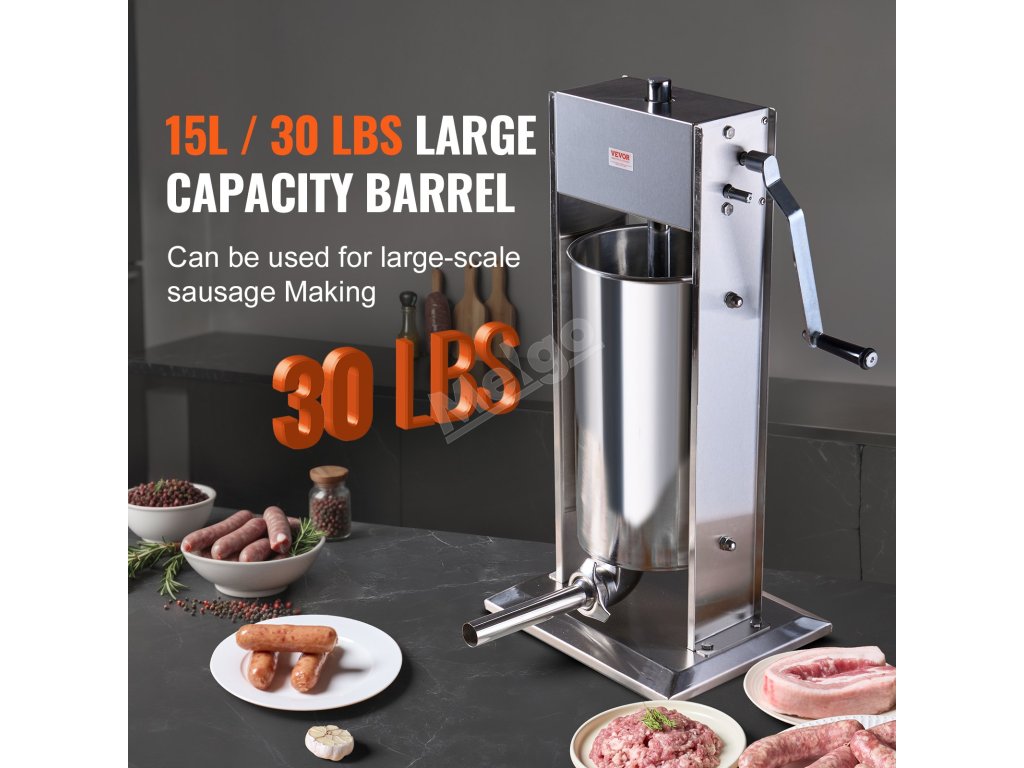 Kapacita 15 l umožňuje výrobu většího počtu klobás najednou. Naklápěcí konstrukce sudu umožňuje přímé nasypání ingrediencí a rychlou výrobu klobás.