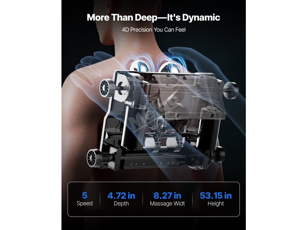 Válečky s 6 masážními technikami a 15 inteligentními režimy simulují profesionální hnětení, poklepávání a akupresuru. Je určen pro ztuhlá ramena a krk, bolesti bederní páteře a otoky ze stání, pomáhá zmírnit nepohodlí a výrazně snižuje únavu.