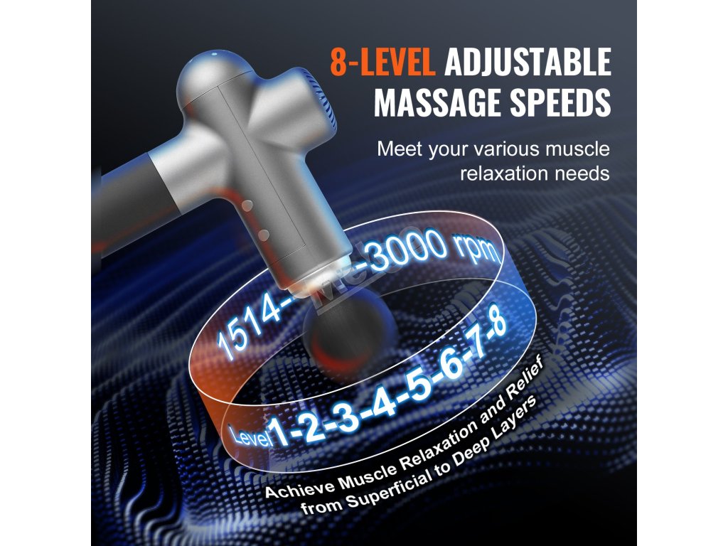 Díky 8 nastavitelným stupňům rychlosti nabízí tento perkusní masážní přístroj pro hluboké svalstvo intenzitu od 1514 otáček za minutu do 3000 otáček za minutu. Ať už potřebujete jemnou relaxaci nebo hloubkovou masáž, aktivuje svalové skupiny a rychle odstraňuje svalovou únavu.