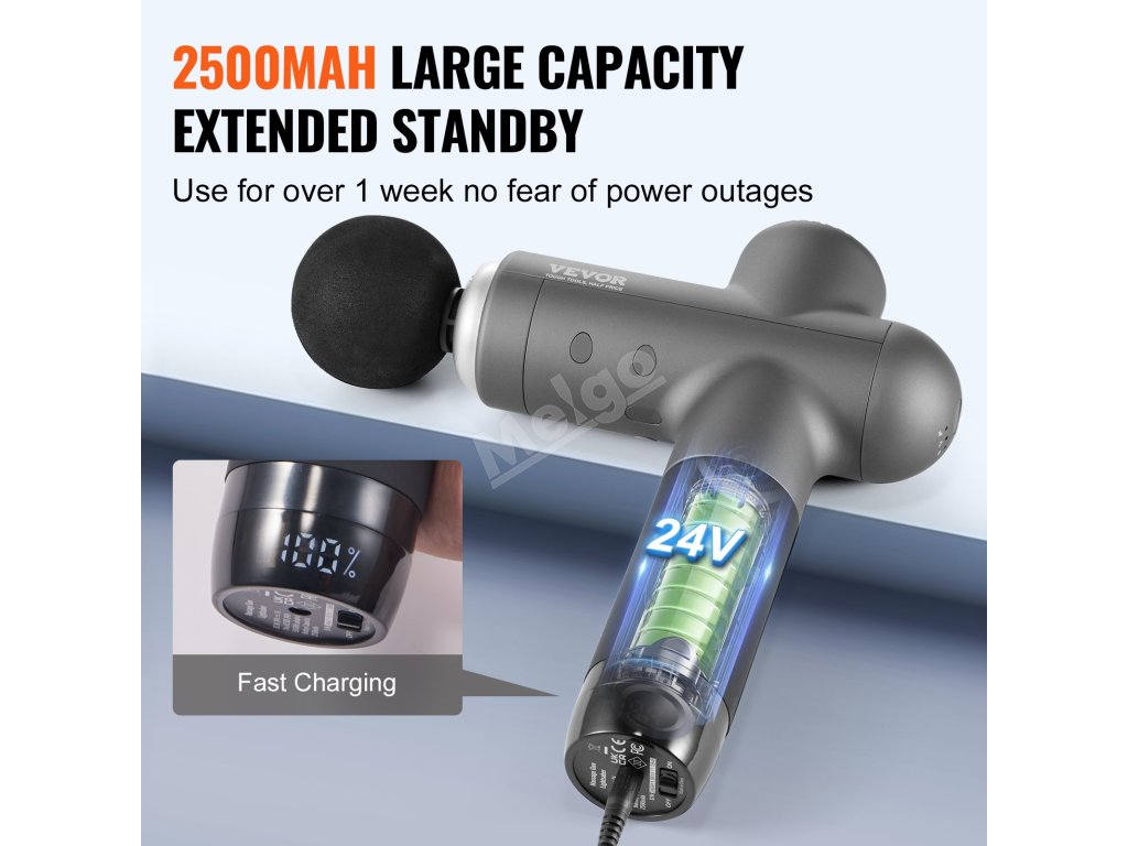Tato ruční masážní pistole je vybavena vysokokapacitními bateriemi s napětím 24 V a kapacitou 2500 mAh, které zaručují dlouhou životnost a odstraňují potíže s častým dobíjením. Zůstaňte napájeni kdykoli a kdekoli a užívejte si nepřetržité posilování svého zdraví.