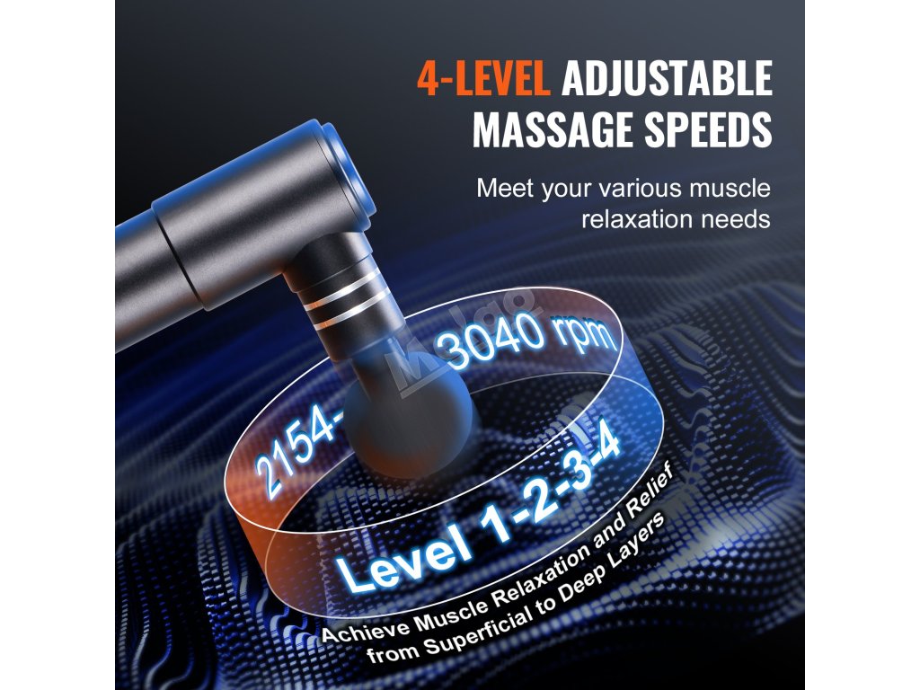 Díky 4 nastavitelným stupňům rychlosti nabízí tento perkusní masážní přístroj pro hluboké svalstvo intenzitu v rozmezí od 2154 otáček za minutu do 3034 otáček za minutu. Ať už potřebujete jemnou relaxaci nebo hloubkovou masáž, aktivuje svalové skupiny a rychle odstraňuje svalovou únavu.
